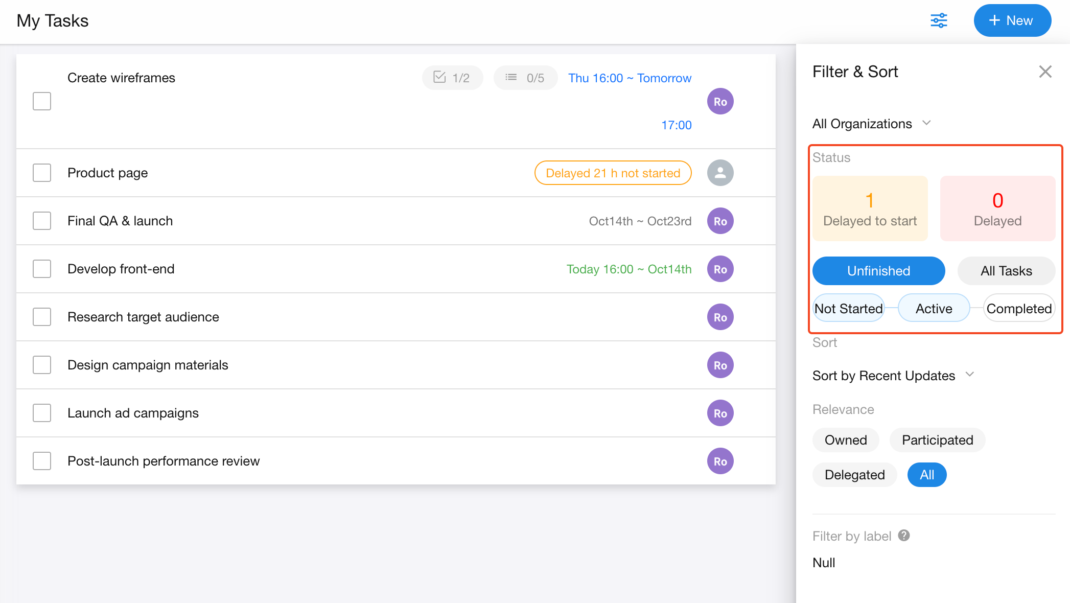 - Planned start date is set, actual start date is empty, and the planned start date is before today: Not Started (Overdue Start)