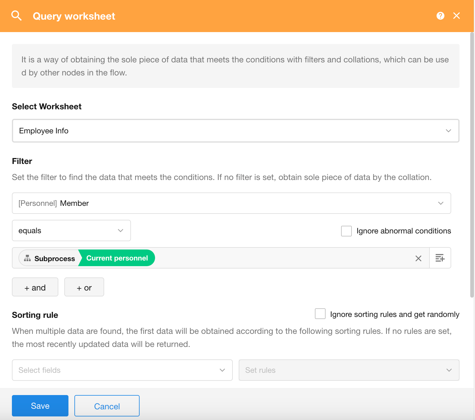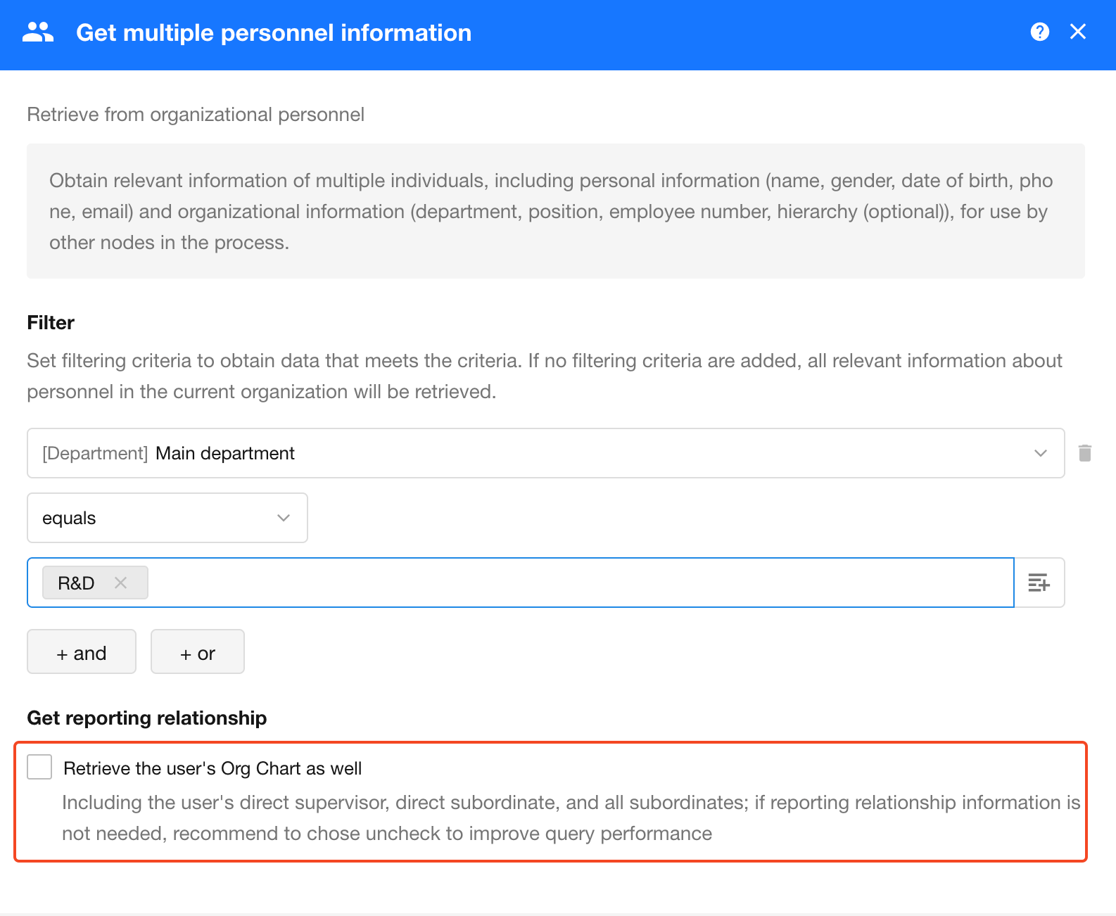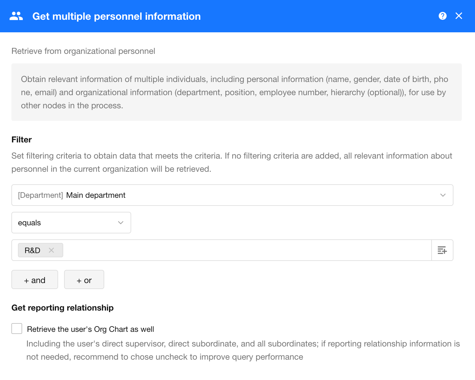 You can think of the organization’s member, department, and role management lists as a kind of “system table” or “hidden worksheet.” With this node, you can retrieve information for multiple members, departments, or roles.