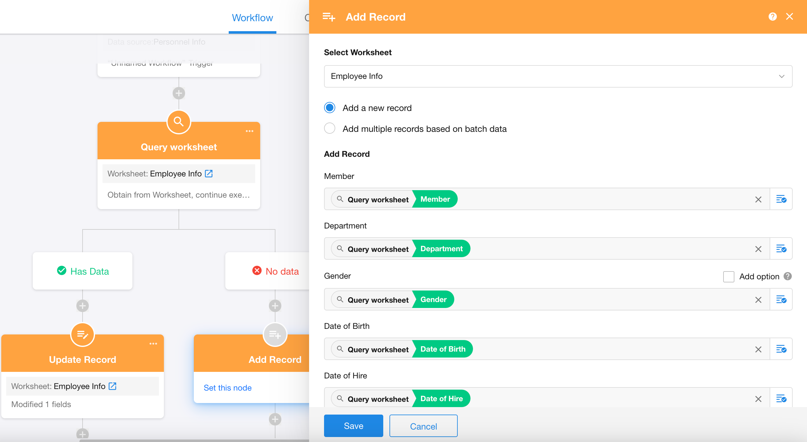 5. Use the “Get Single Data” node to check if a record for this member already exists in the worksheet