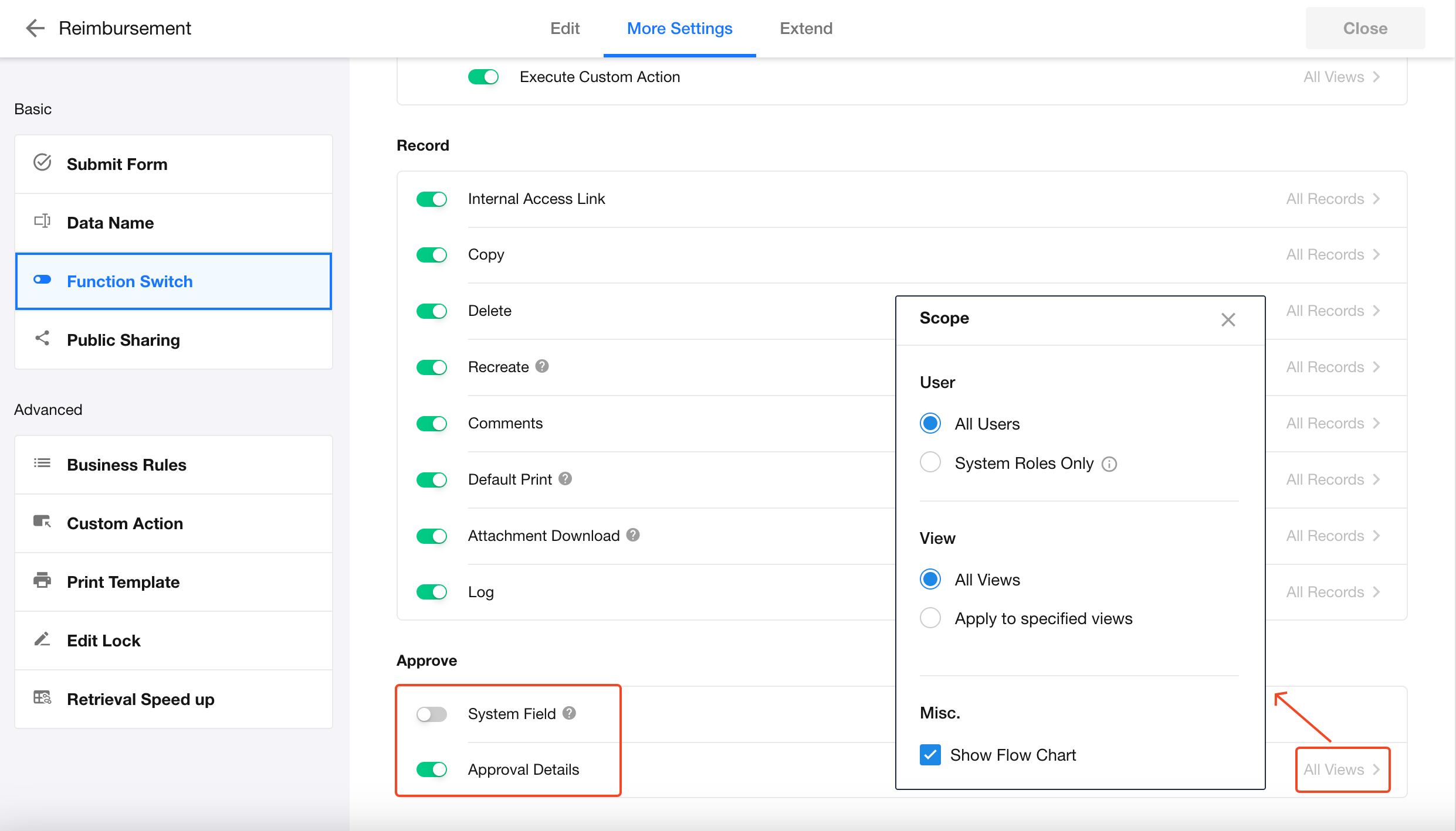 The status of the current approval, the approver, and the flowchart can be displayed directly in the view. You can check the flow status, or process the approval when you view the record. As shown below: