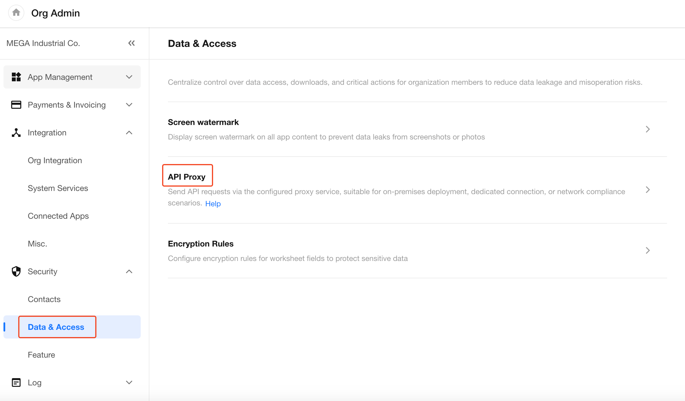 Proxy settings must be configured by an organization admin in: Integration > Security > Data & Access in the Organization Admin Console.