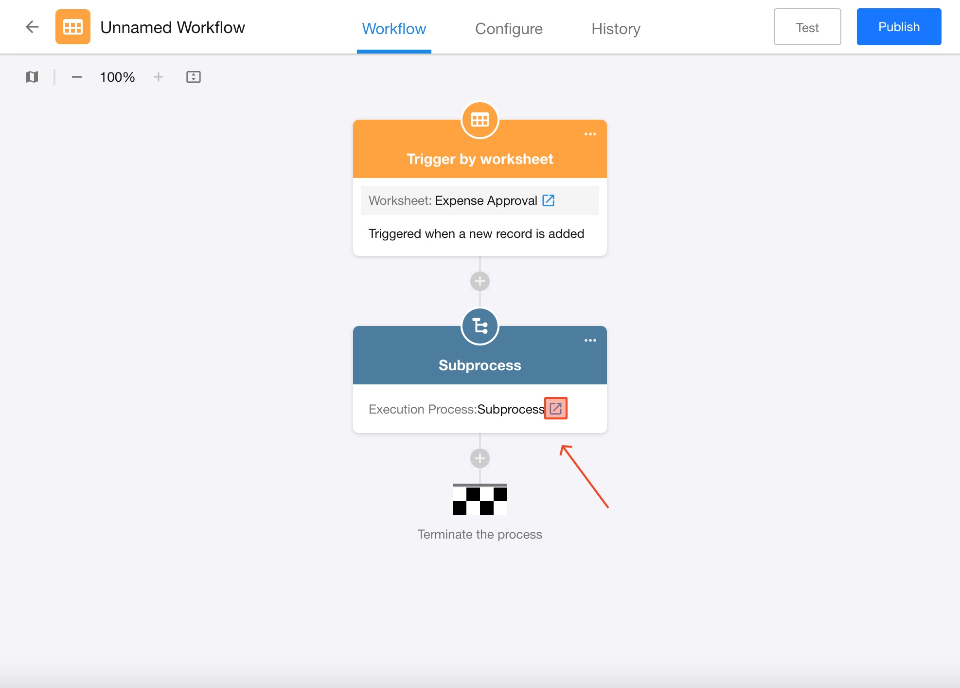 In workflows triggered by a custom button, you can directly add a subprocess node and select an existing subprocess to reuse.