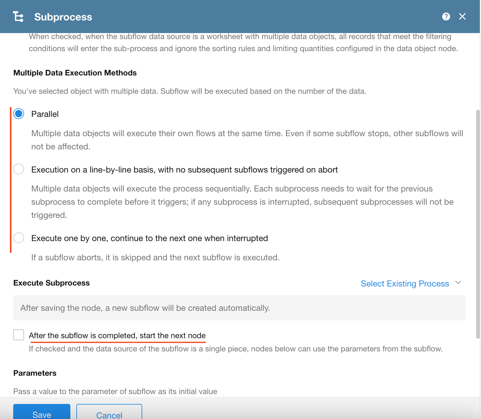 D. If you check "After the subprocess is completed, start the next node", the next node will only execute after the subprocess finishes. If unchecked, both the subprocess and subsequent nodes in the main workflow will execute in parallel. The subprocess result will not affect the current workflow.