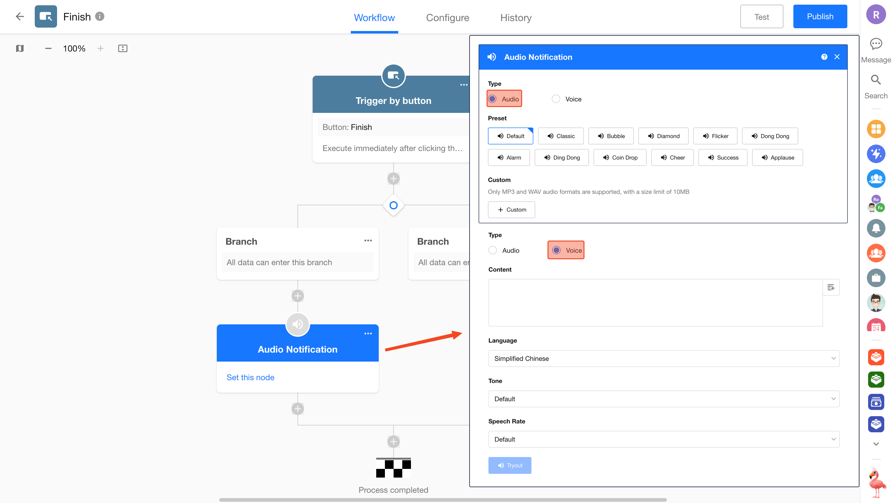 Node Function: When the workflow reaches this node, it can automatically play a text message or audio file to the workflow trigger initiator.