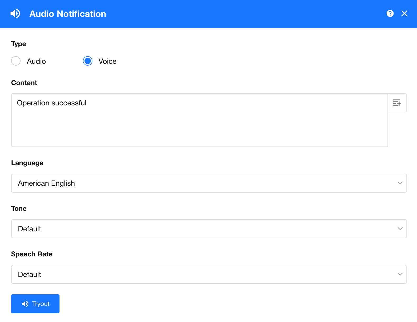 Click the Tryout button to directly play the text entered in the “Content” field.
