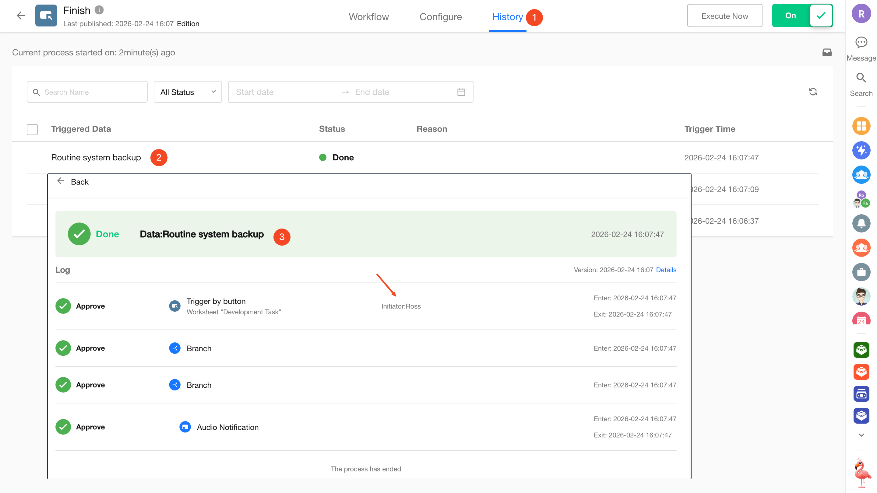• The Audio Notification node in Workflow B will not play audio because the trigger initiator is “Workflow,” not a user.