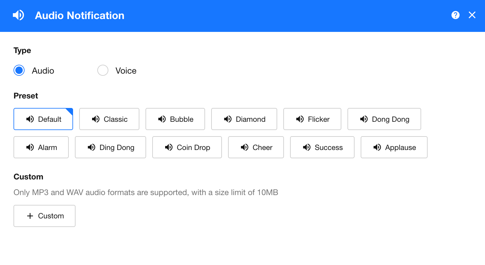 Custom audio files must be in MP3 or WAV format and no larger than 10MB.