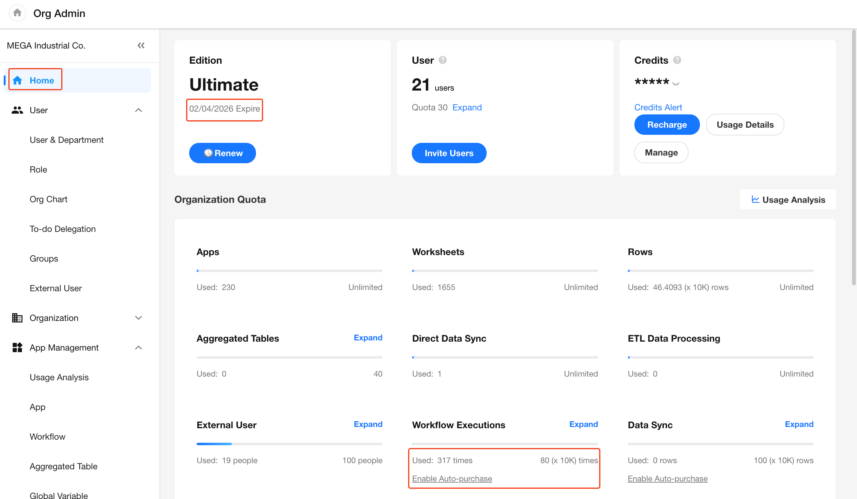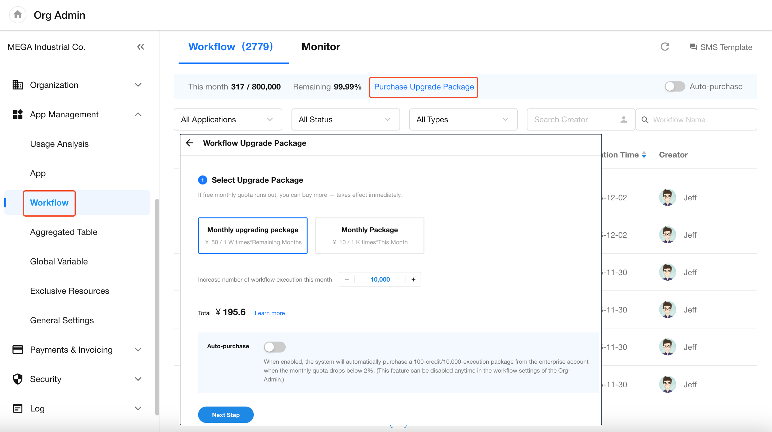 Organization admins can navigate to [Org Admin] > [App Management] > [Workflow], and click “Purchase Upgrade Package” to start the process.