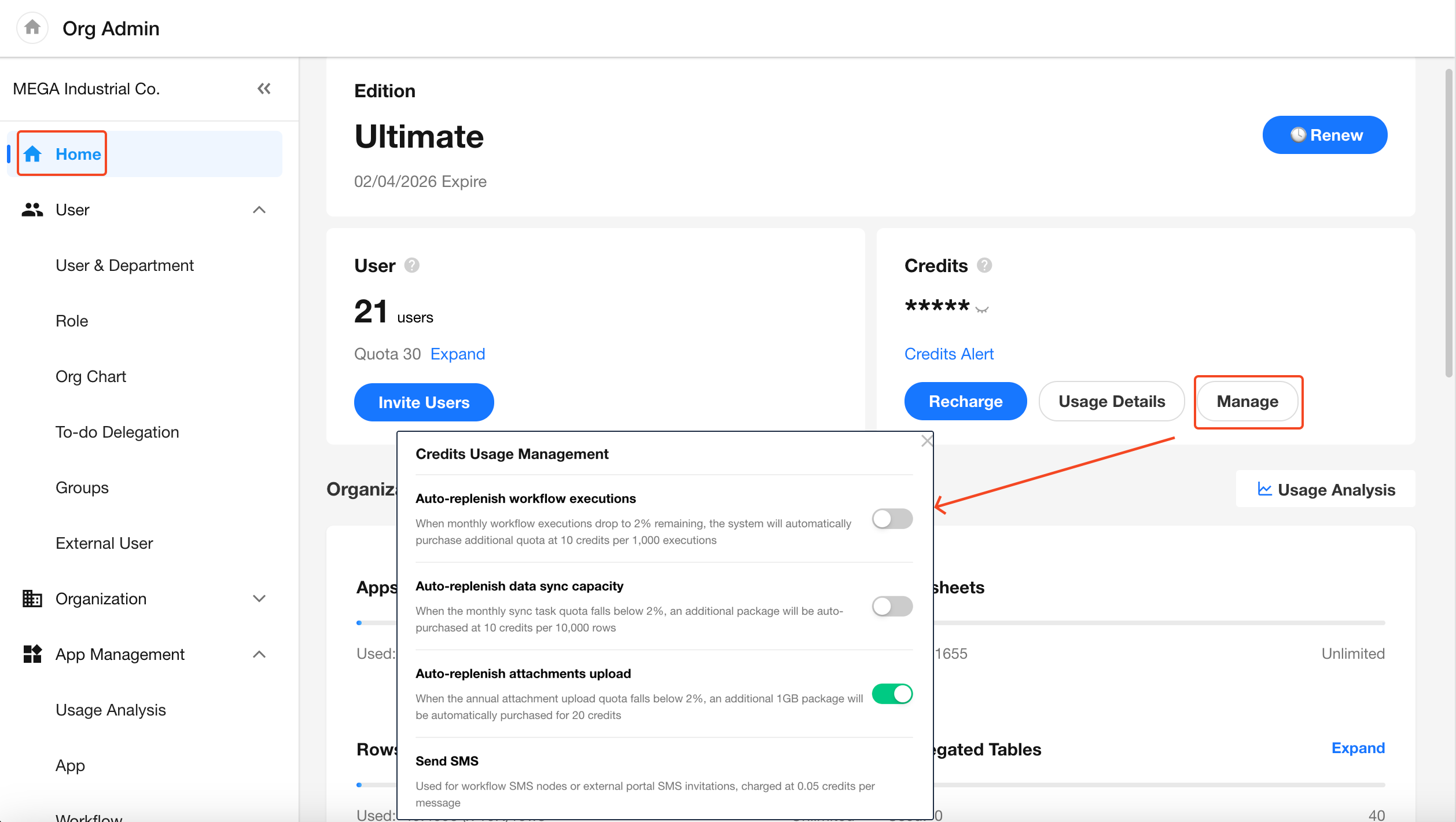 Go to [Admin Console] > [Home] > [Credits], then click “Manage” to configure your auto-purchase settings.