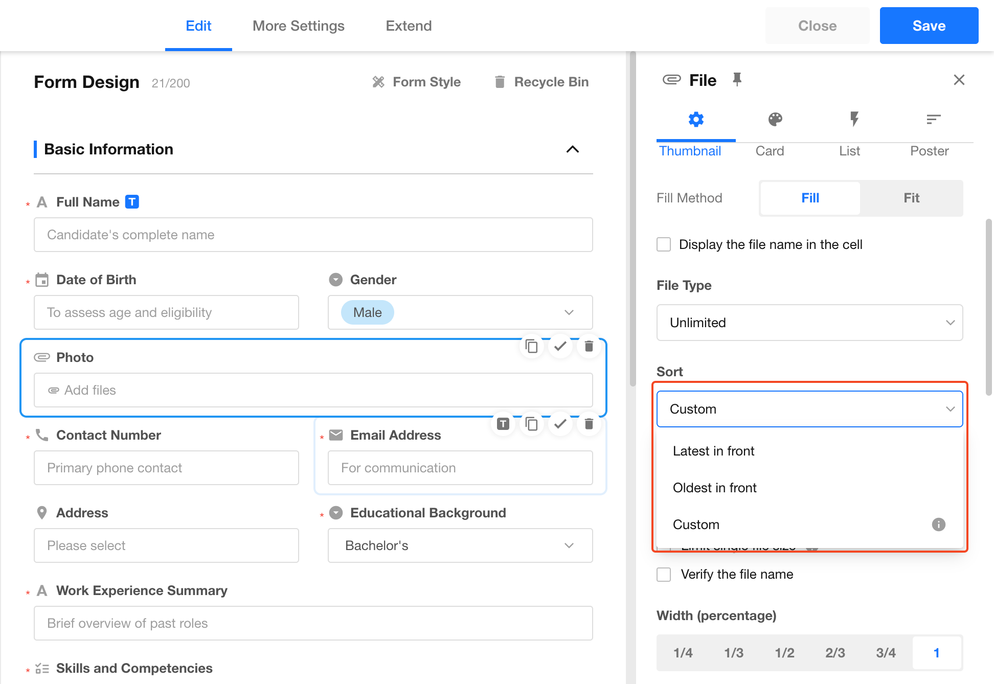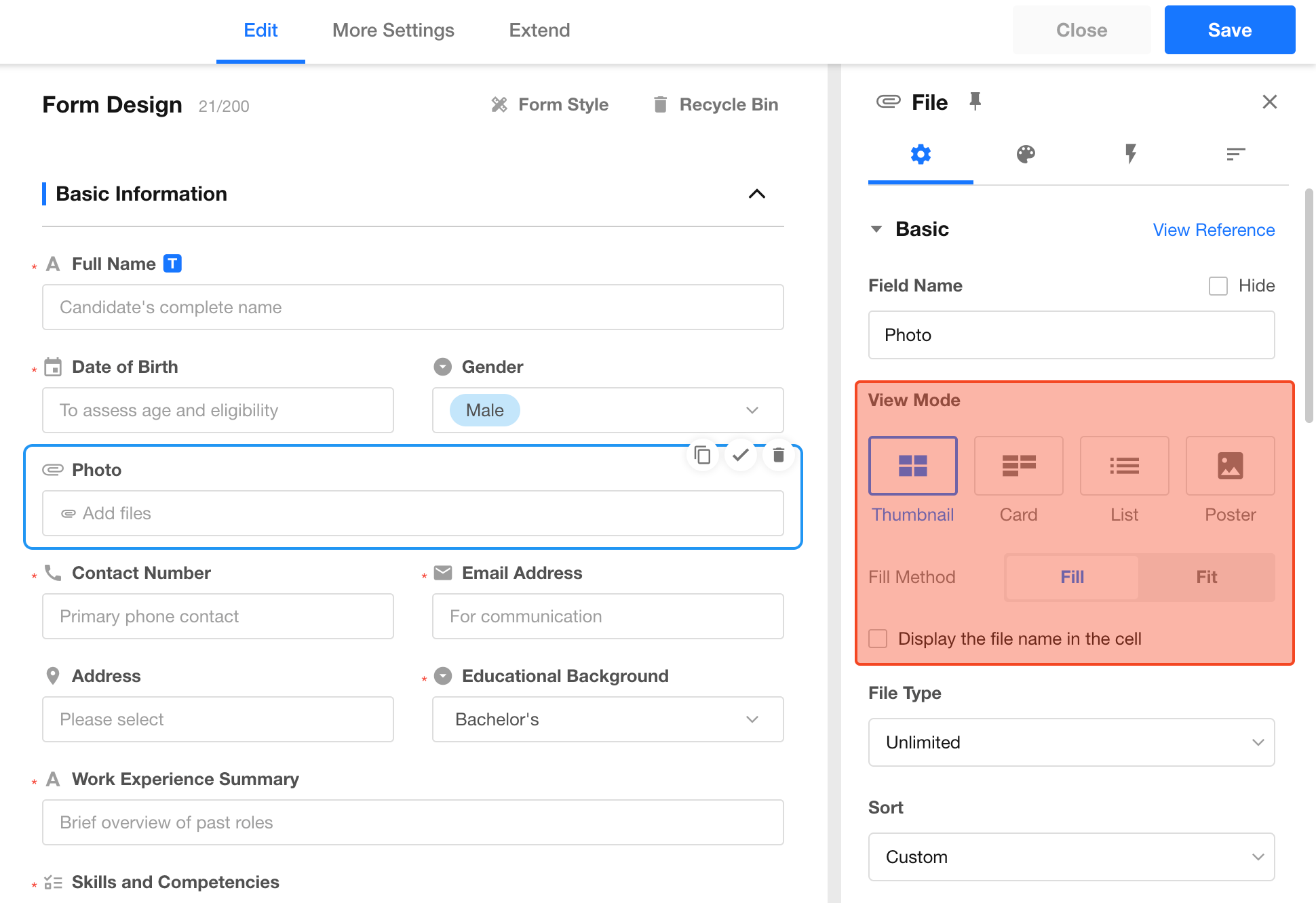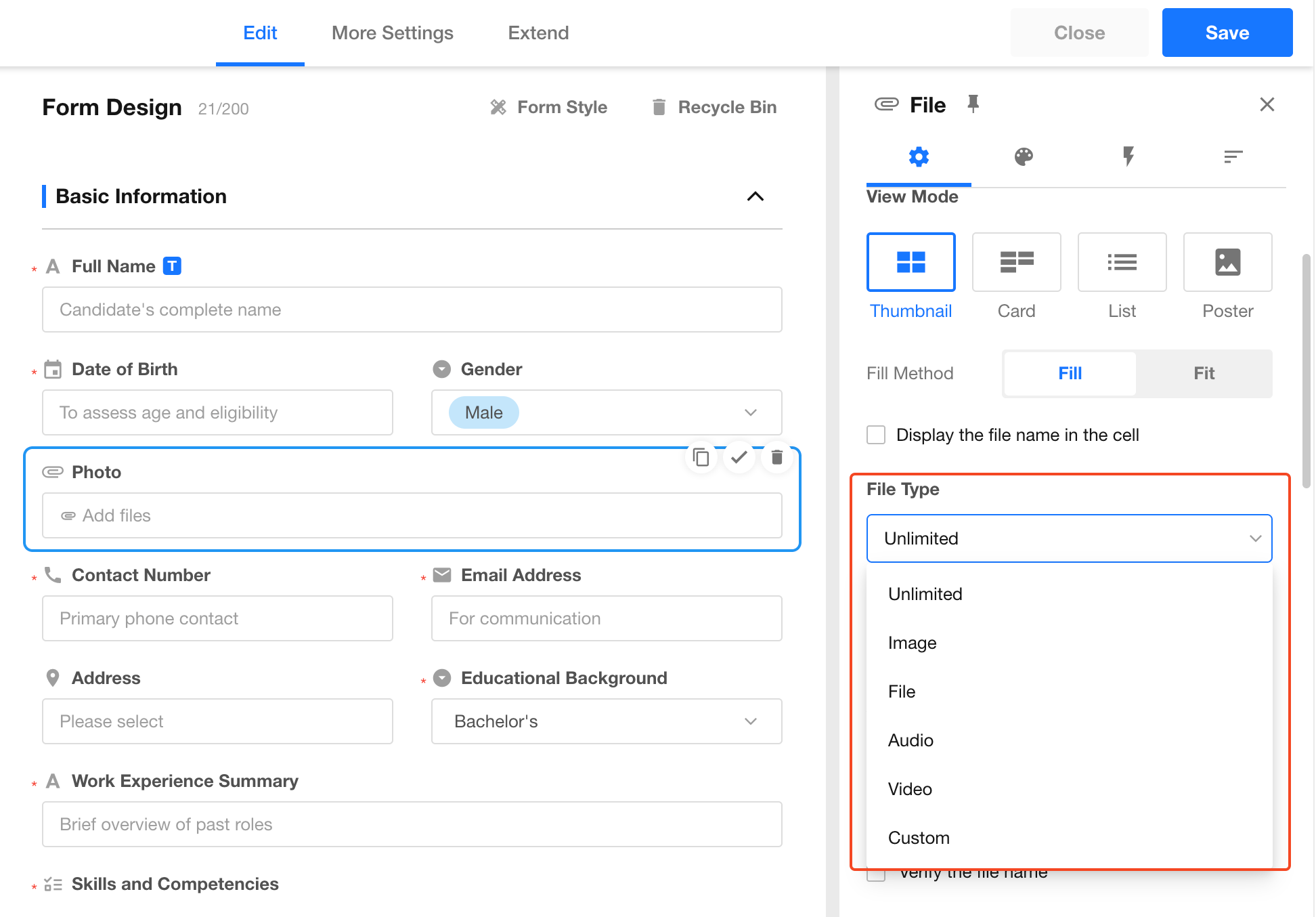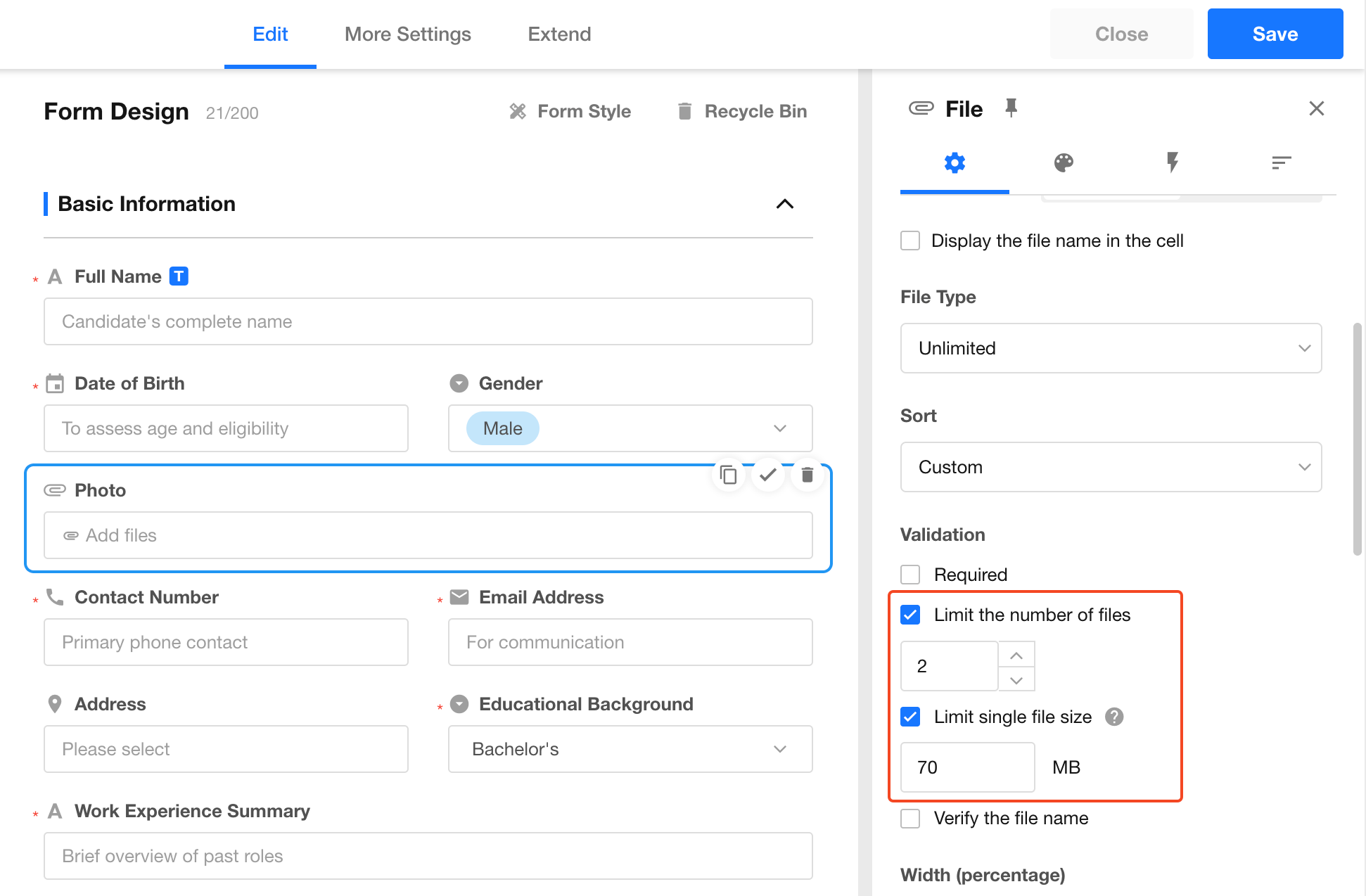 The file control allows you to upload multiple files (documents, images, etc.) directly to a record. You can customize both the display style and upload restrictions.