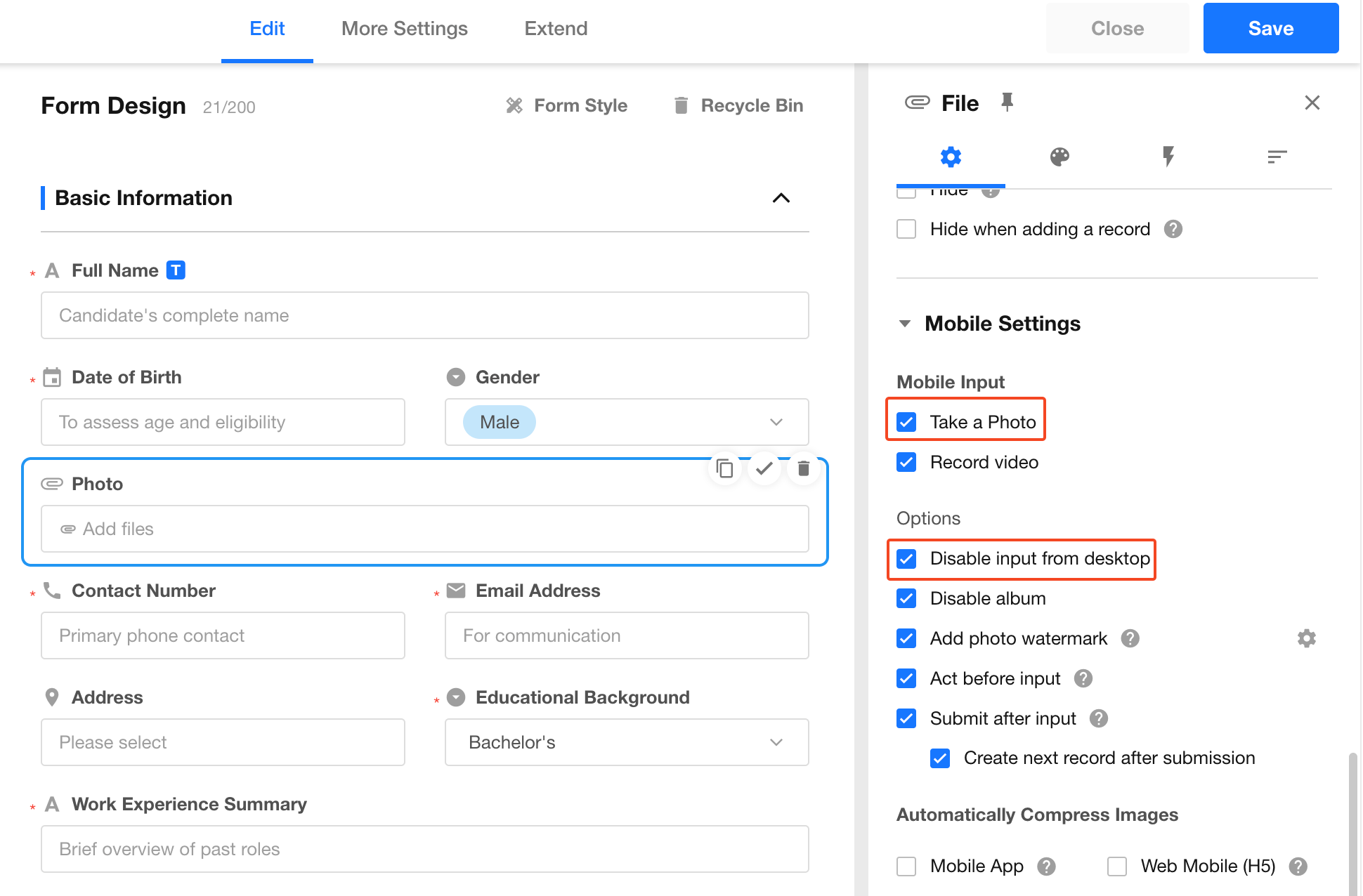 To restrict uploads to mobile devices only (no desktop uploads), enable Disable Input from Desktop as shown below:
