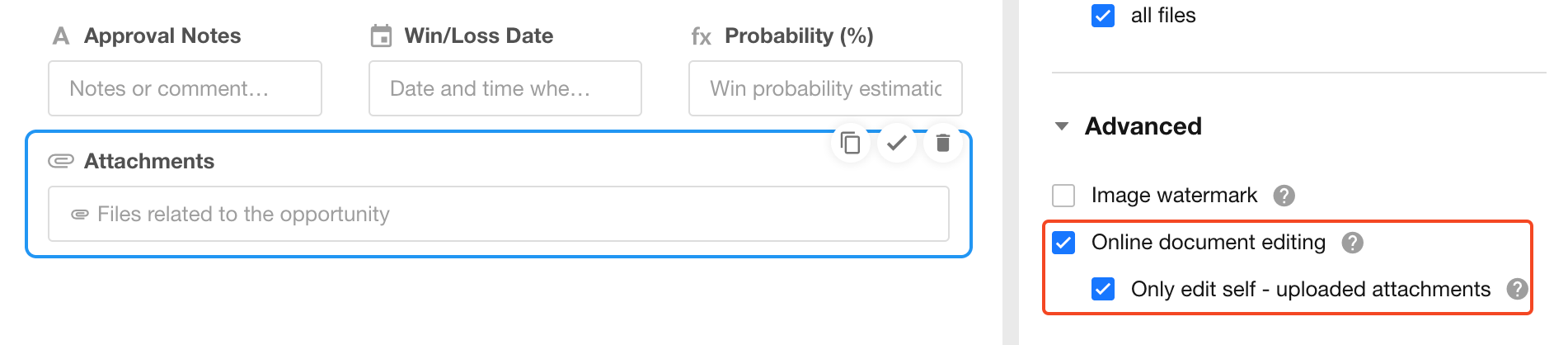 - If Only edit self-uploaded attachments is enabled, only the file owner can edit