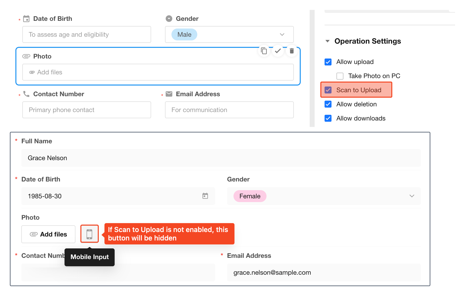 When editing a record on a PC while files or photos are stored on a mobile device, click Scan to Upload and scan the QR code to upload files directly from your phone to the PC.