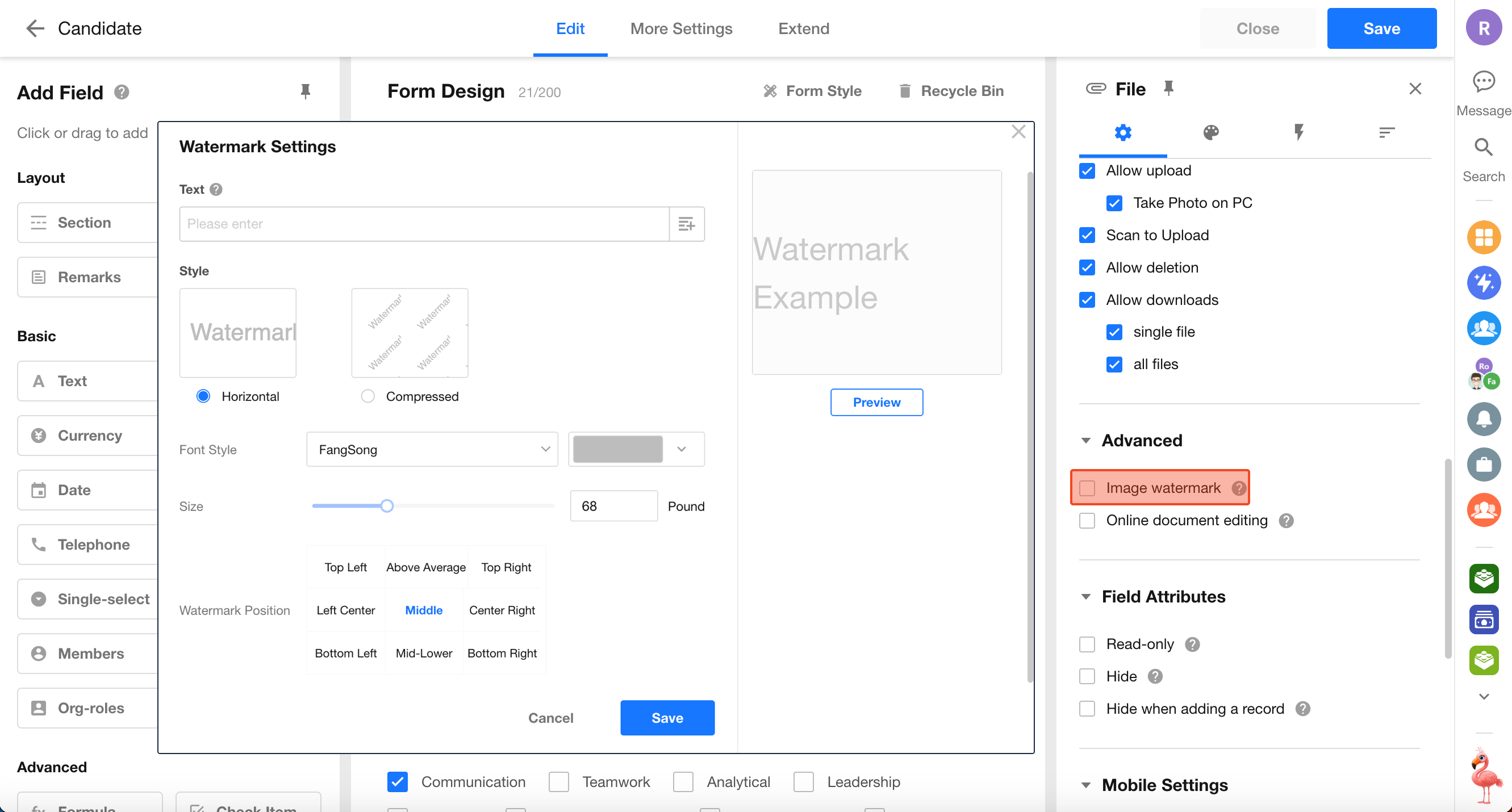 Watermark content supports combining fixed text and field values, with a maximum of 100 characters.