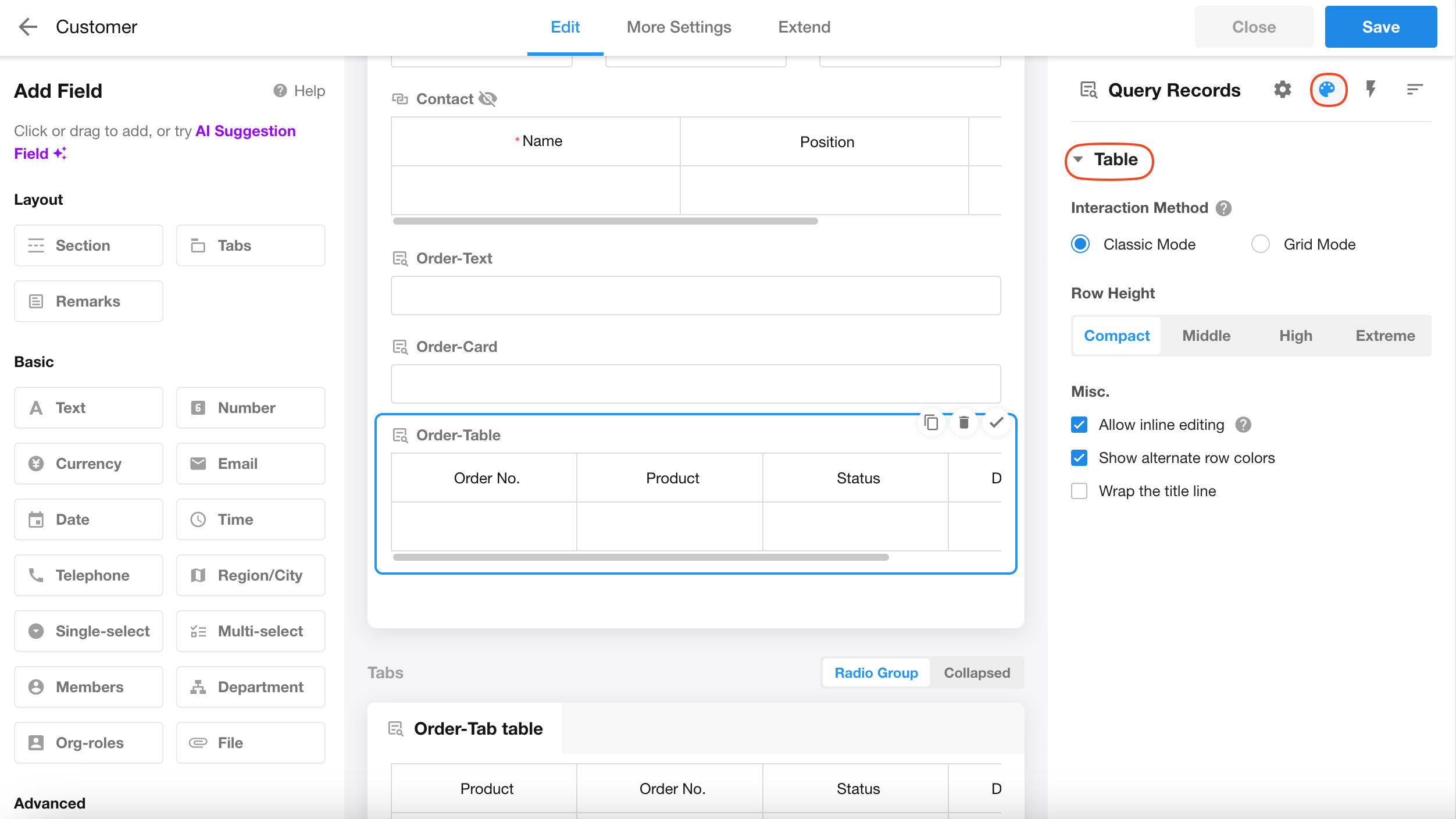 Use Case: As shown below, the Order worksheet is related to the Customer worksheet (a one-way relationship, meaning the Customer worksheet is not related to the Order worksheet). Now, we want to enable users to view all orders related to a specific customer directly in the Customer worksheet using the Query Records control.