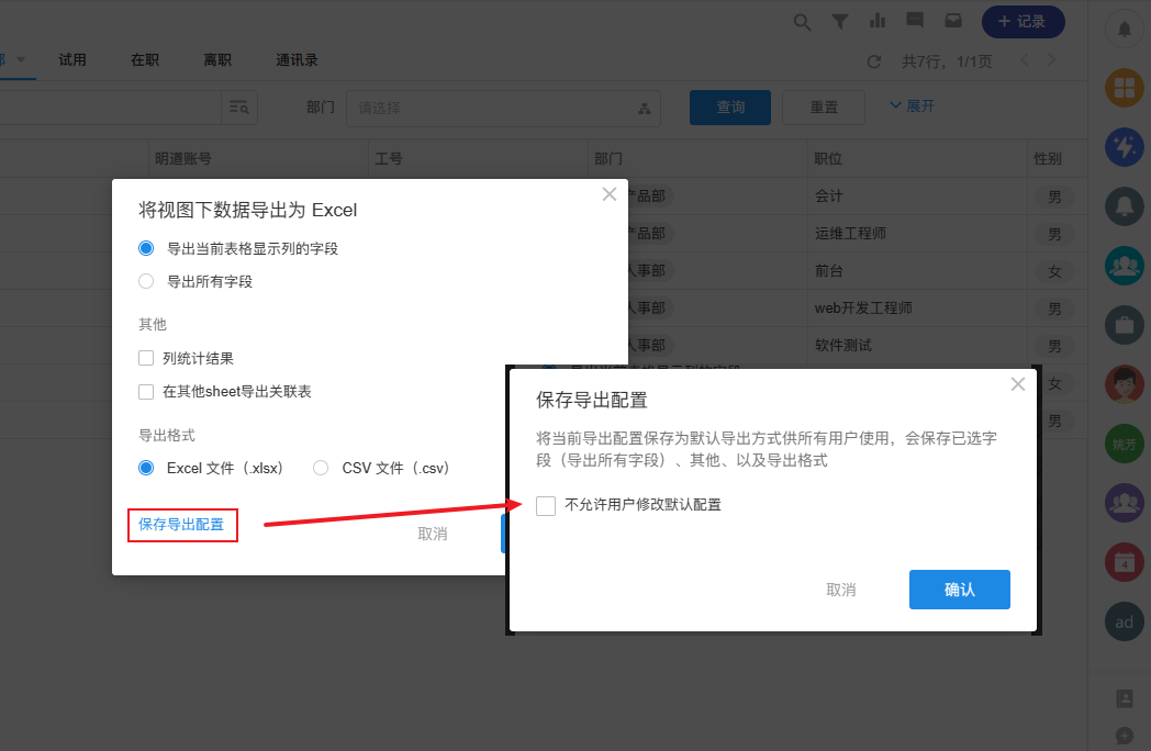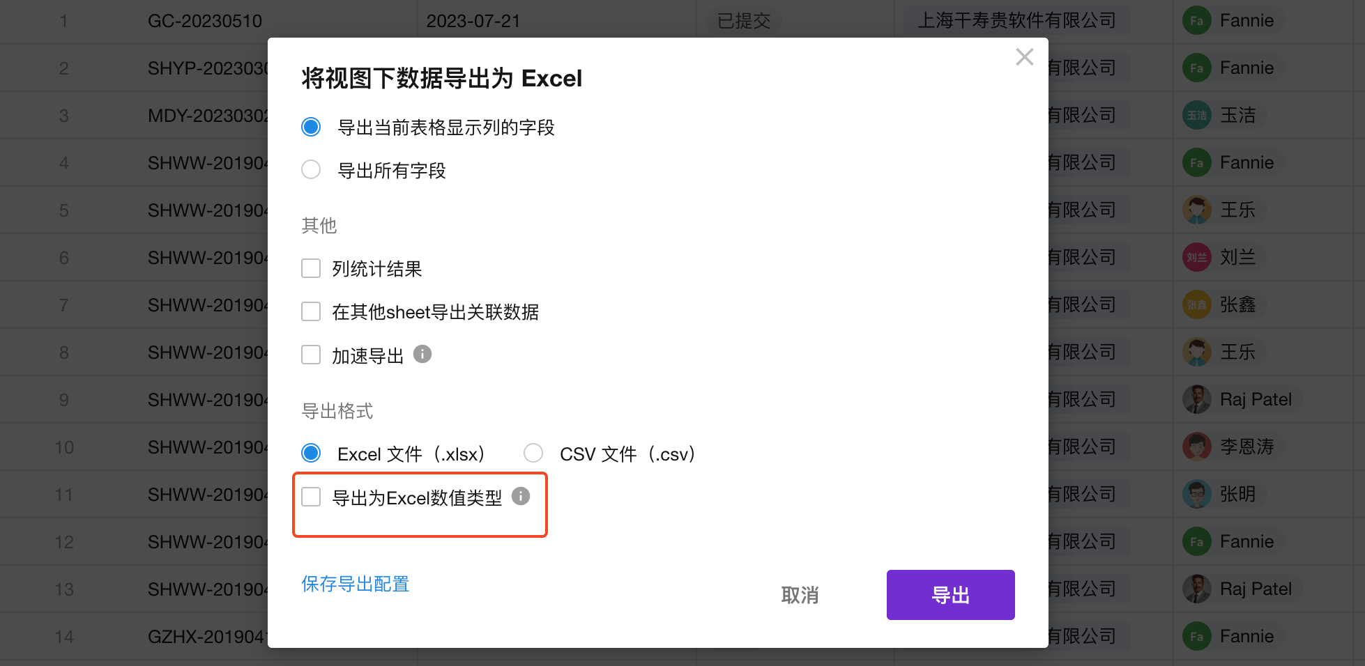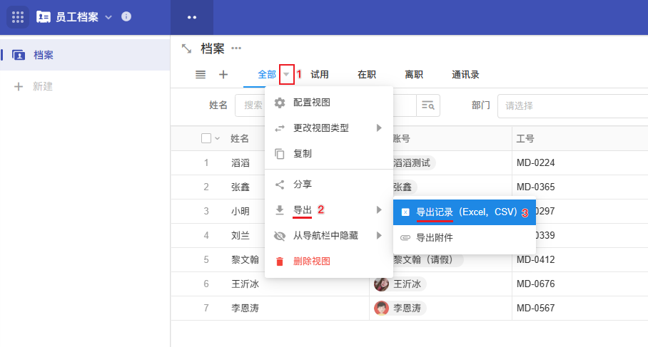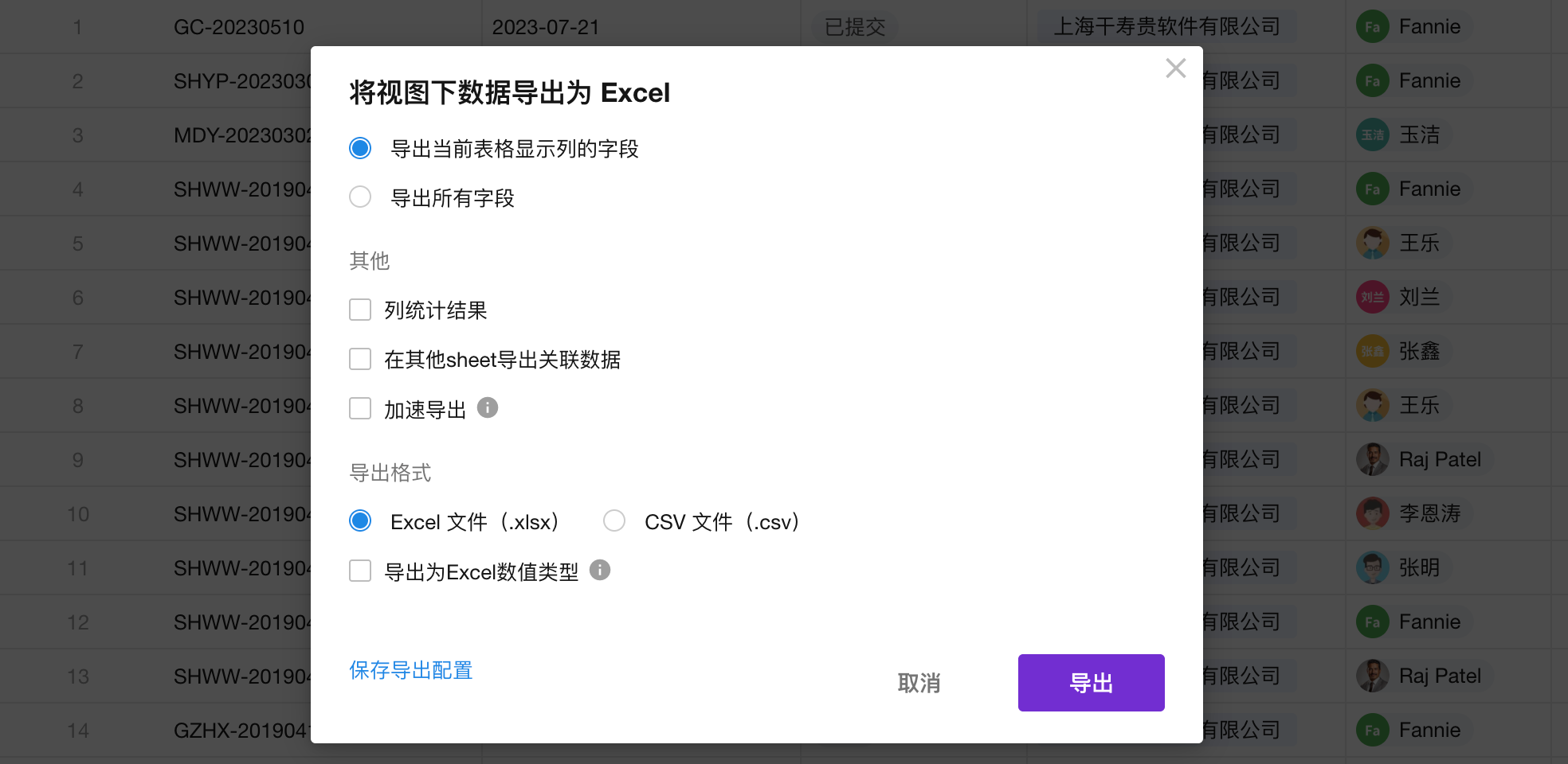 此操作只有【表格视图】下可用,其他视图下只能导出全部可见记录。