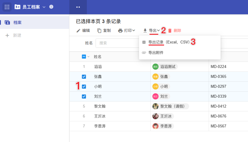 勾选需要导出的记录 > 操作栏选择“导出” > 选择“导出记录”