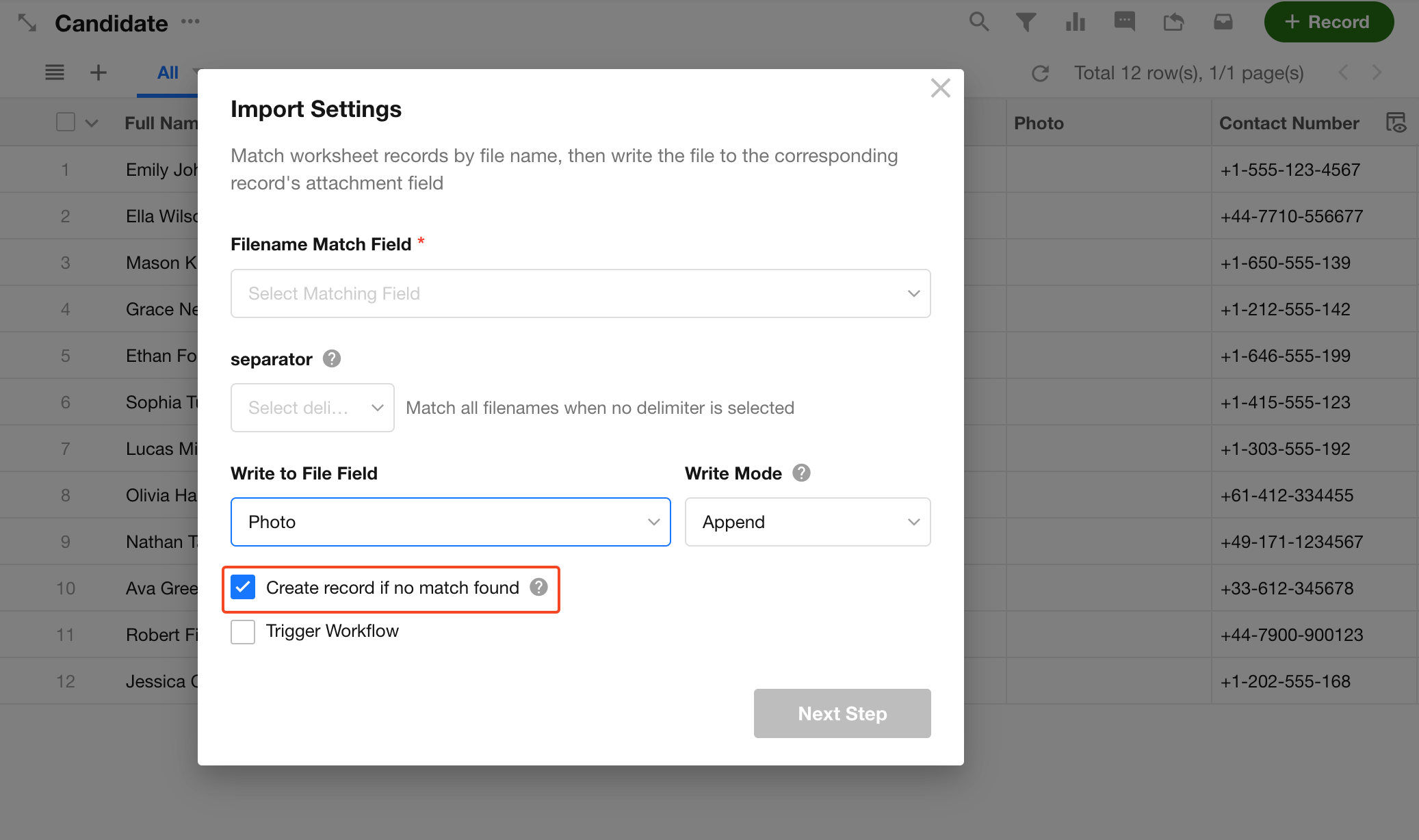 If Create records when no match is found is enabled, unmatched files will automatically create new records: