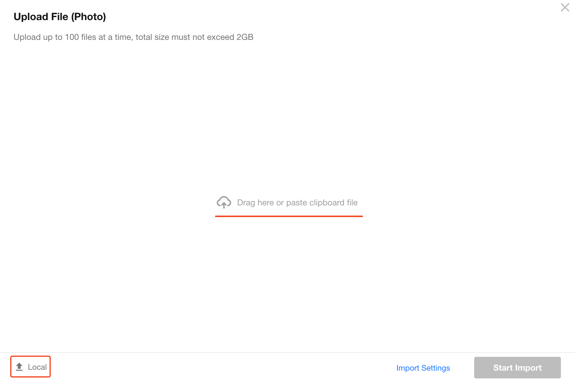 You can upload individual files, entire folders, or paste files directly from the clipboard. After uploading, click Start Import.
