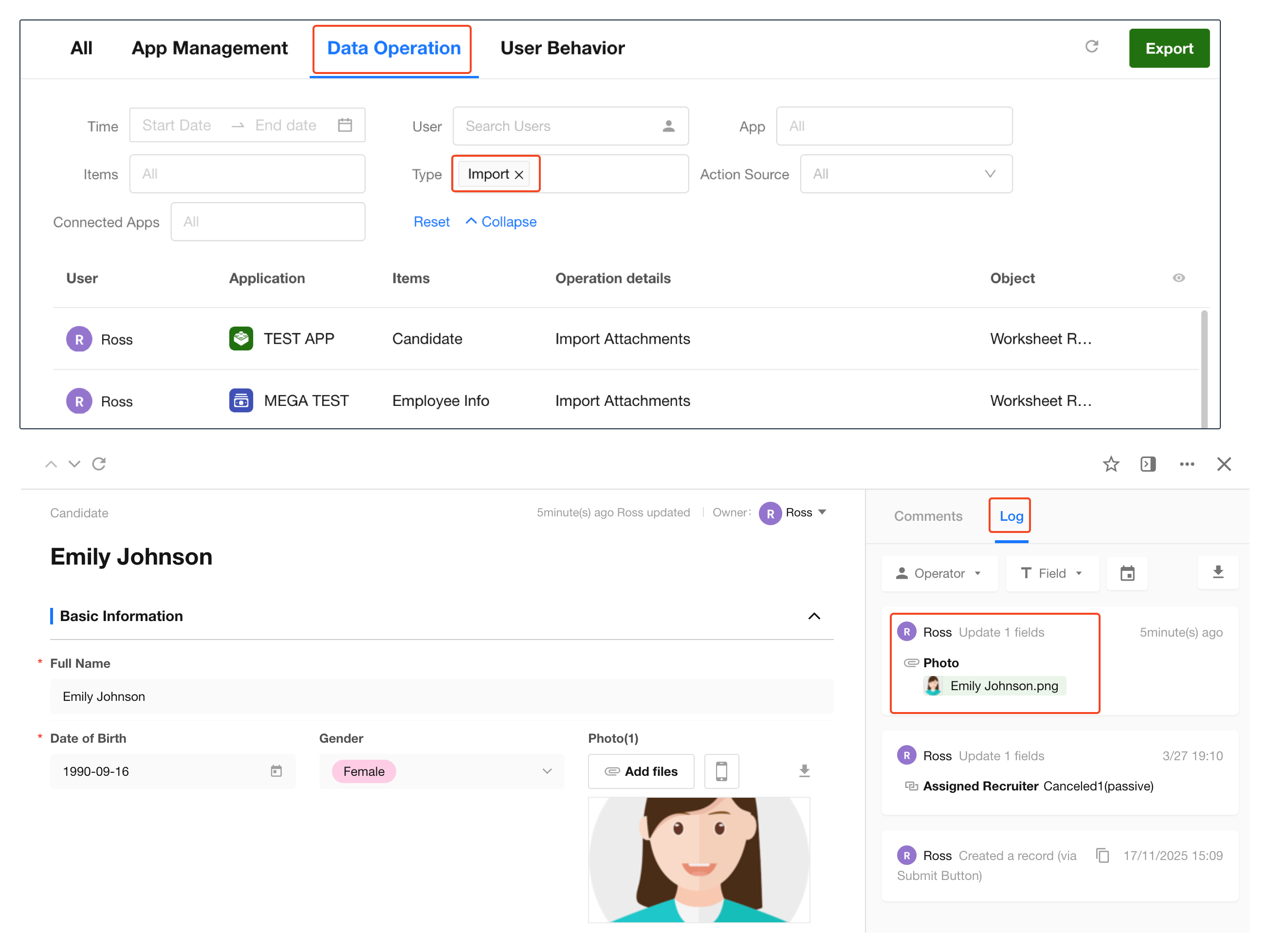 Under Data Operation, operation type is Import, and object is Worksheet Record -