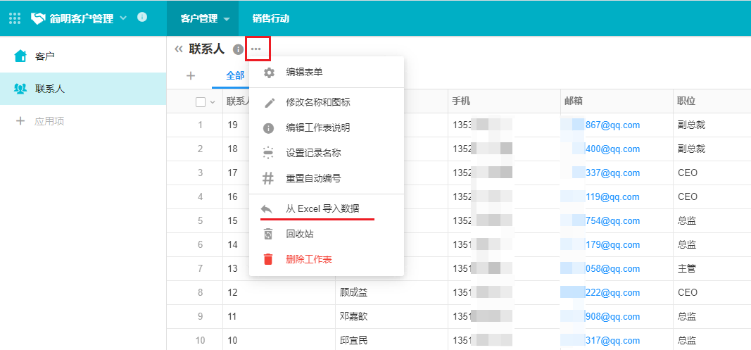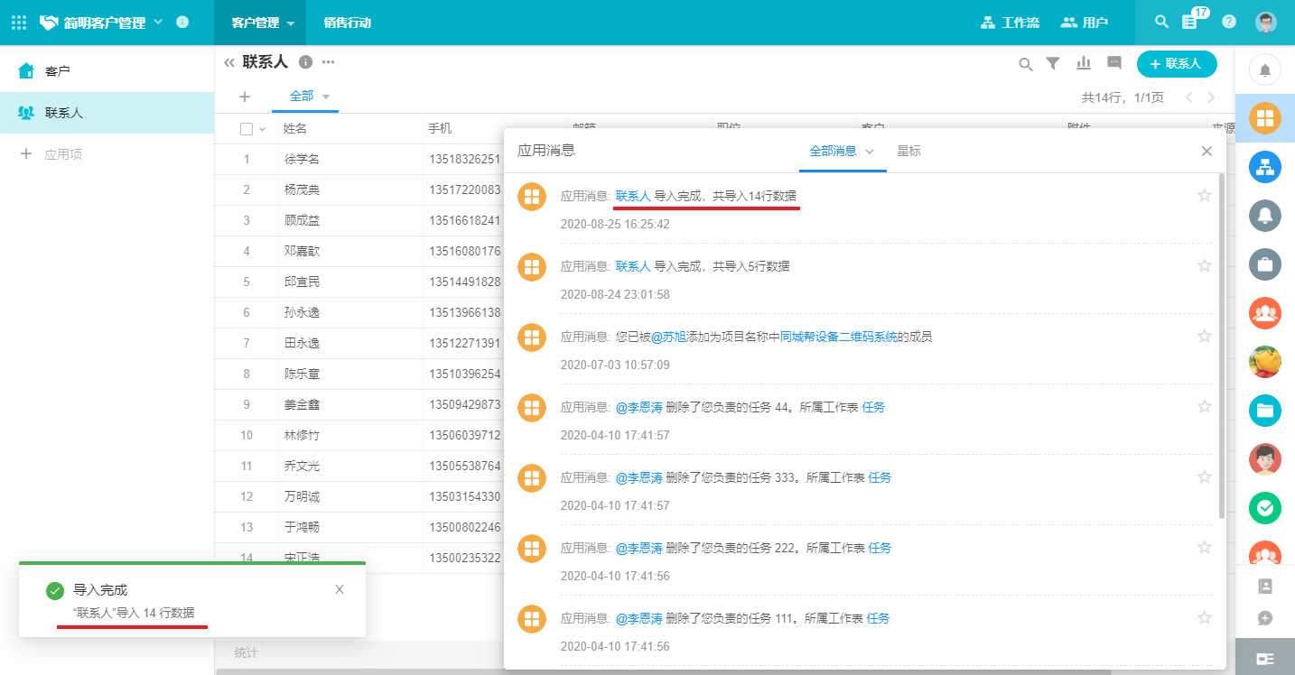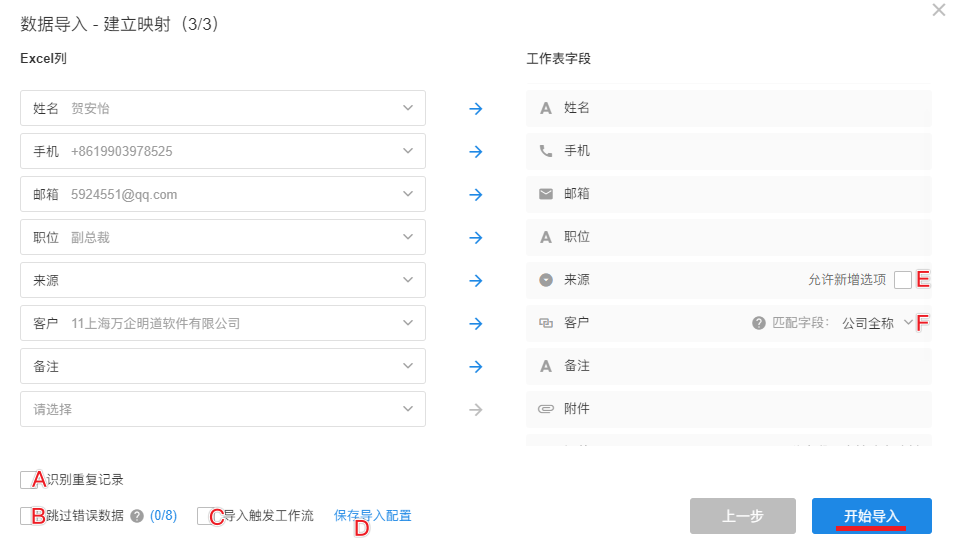 导入时可以自动建立和其他表记录的关联关系。例如,导入联系人时,有个公司的字段,如果公司已经在《客户公司表》中存在,那么可以自动关联到对应的公司记录。
