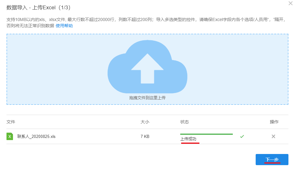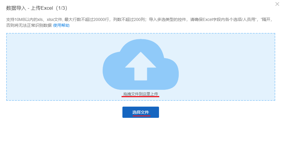 支持10MB以内的xls、xlsx文件, 最大行数不超过20000行,列数不超过200列;