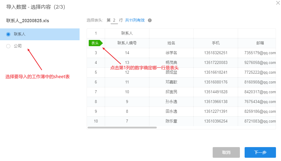 表头,即字段名称(Excel中的列名),选择后,表头下方的数据作为内容将导入到工作表中(表头信息不会导入)。表头不能为空,如果两列之间有空的表头,则会导入失败。
