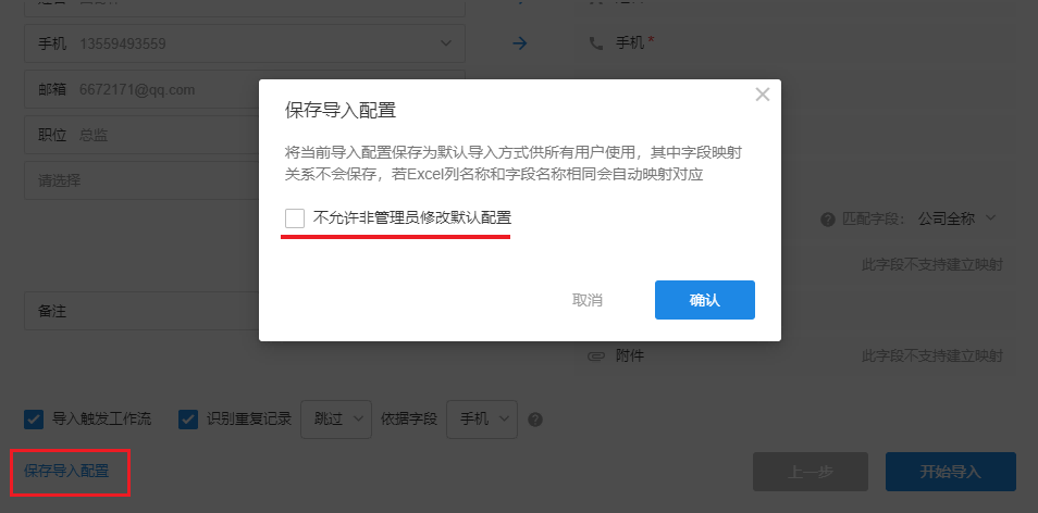 如果勾选了“不允许非管理员修改默认配置”,则普通成员不能更改配置,只能按照保存的配 置进行导入,并且不会出现下面的配置项。