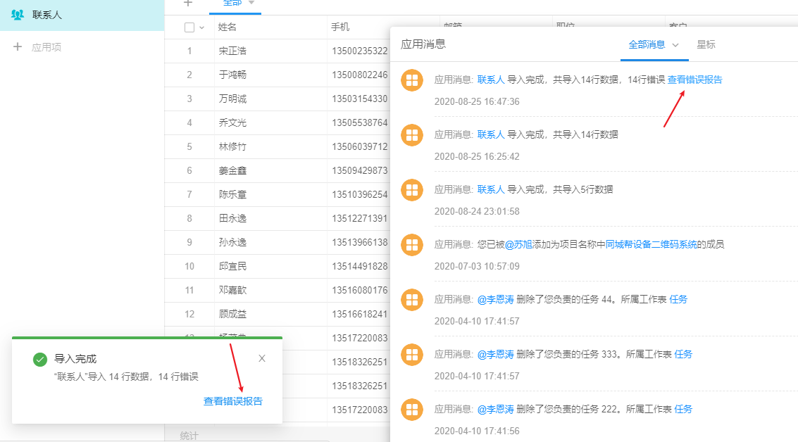 如果有数据未能正常导入,会有结果提示,并能下载到文本格式的错误报告。