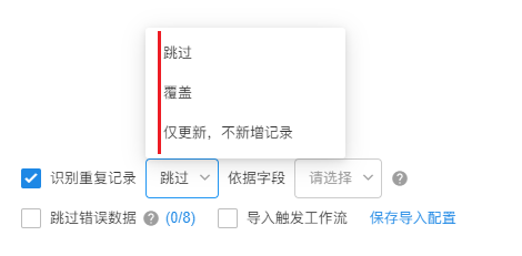 如果勾选,Excel中每行记录正式导入前,会根据“依据字段”(例如工号,手机号、具有唯一性)的内容读取工作表中是否已经有此记录,如果已经存在,则需要选择是更新工作表已有数据,还是跳过这行Excel数据不做任何操作。