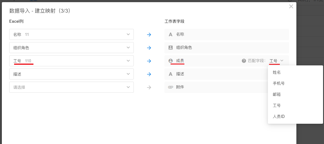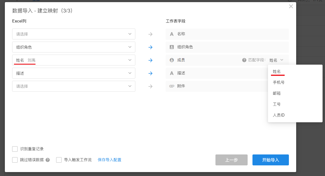 或者不重名的先导入进去,有重名的数据单独导入,导入时,成员字段的导入内容替换为手机号、邮箱工号、人员ID的其中一种,匹配的字段选择对应的字段即可。
