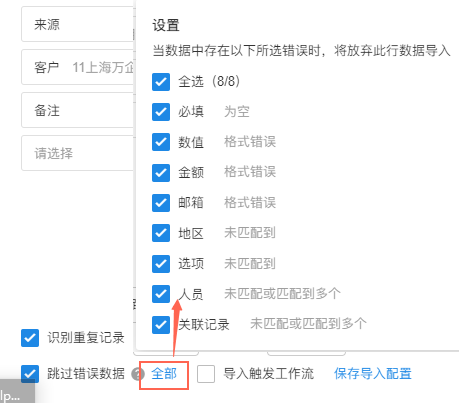 如果勾选了跳过错误数据, 如发现有错误数据,则这一行整体跳过不导入