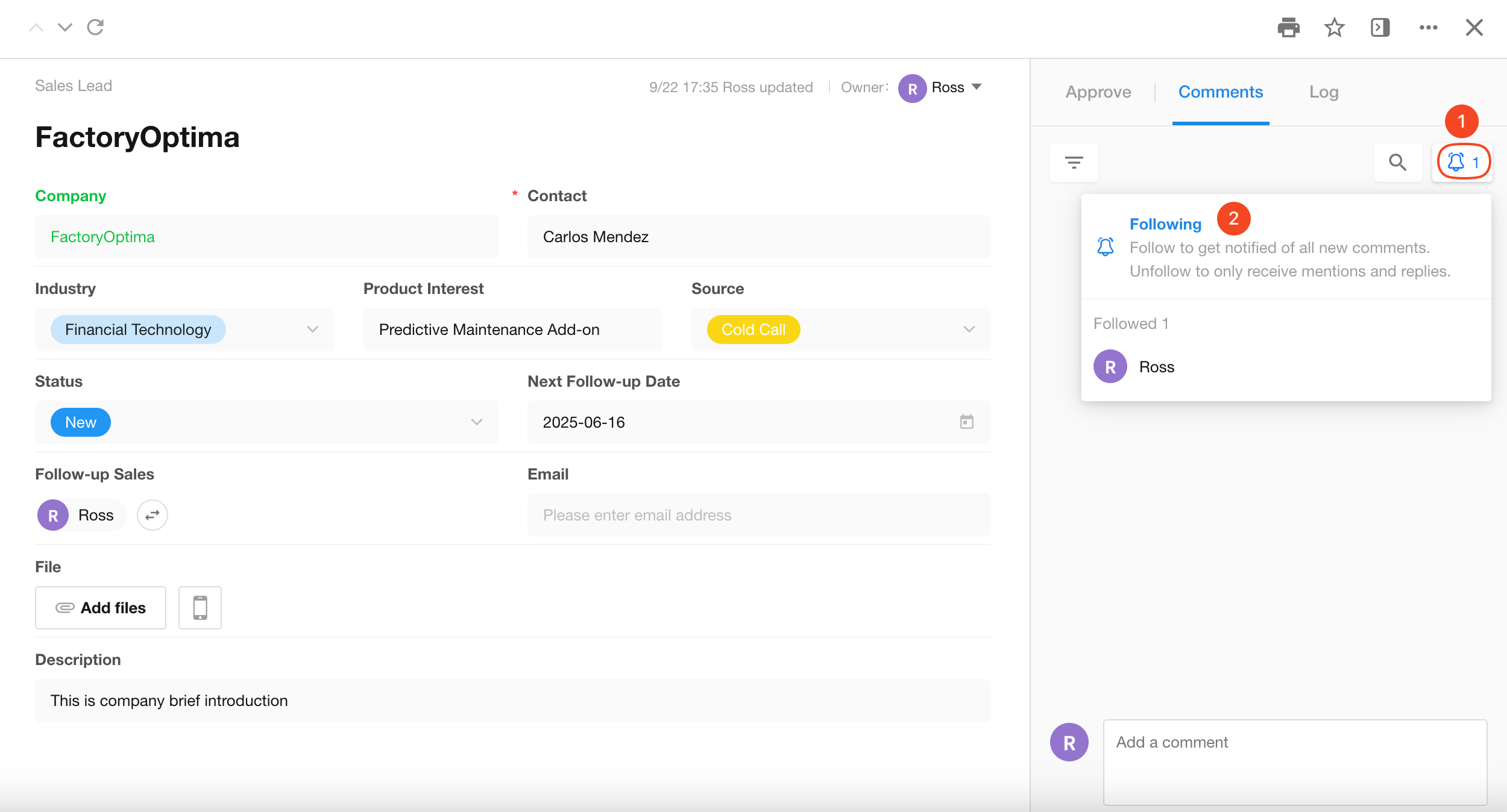 After following a record’s discussion, you will receive notification messages when new comments are posted — even if you are not mentioned with @ or directly replied to.