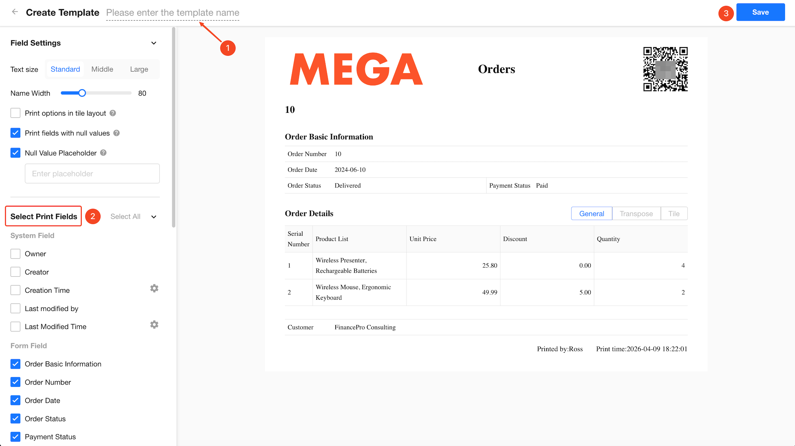 On the left panel, select the fields you want to print and configure the font. The center panel provides a real-time preview. Once the fields, font size, and template name are set, you can save the template.