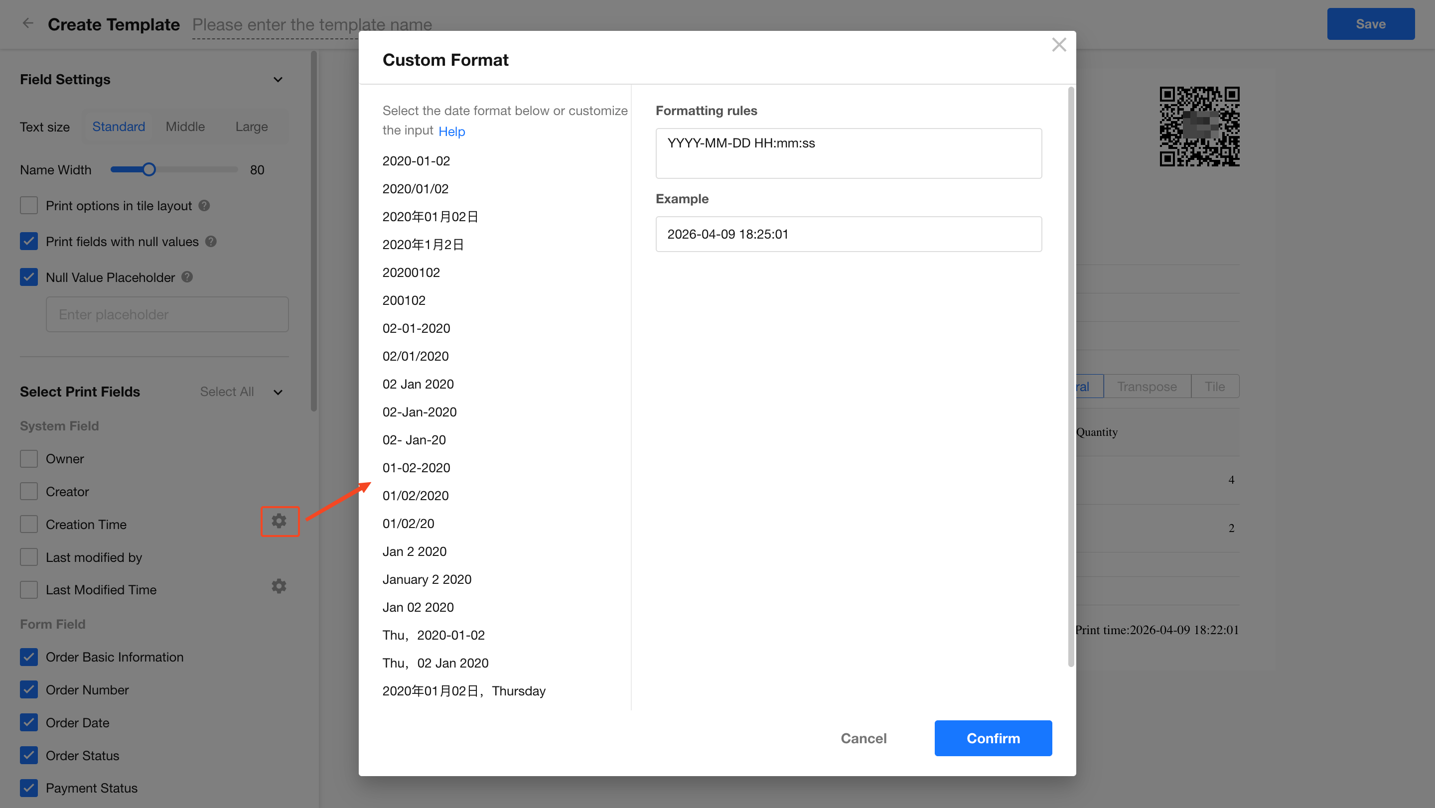 For system time fields like "Creation time" or "Last modification time", you can customize the date/time display format. Click the settings icon next to the field to adjust the format.