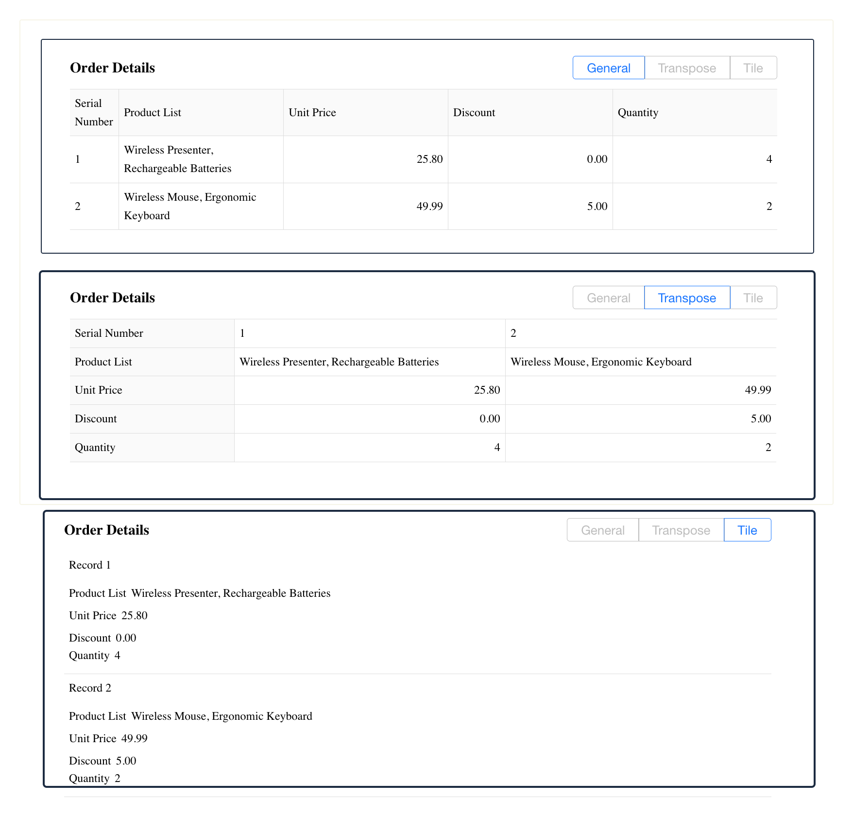 If "Print options in tile layout" is enabled, all options in a tiled option field will be printed—even if they are not selected in the record.