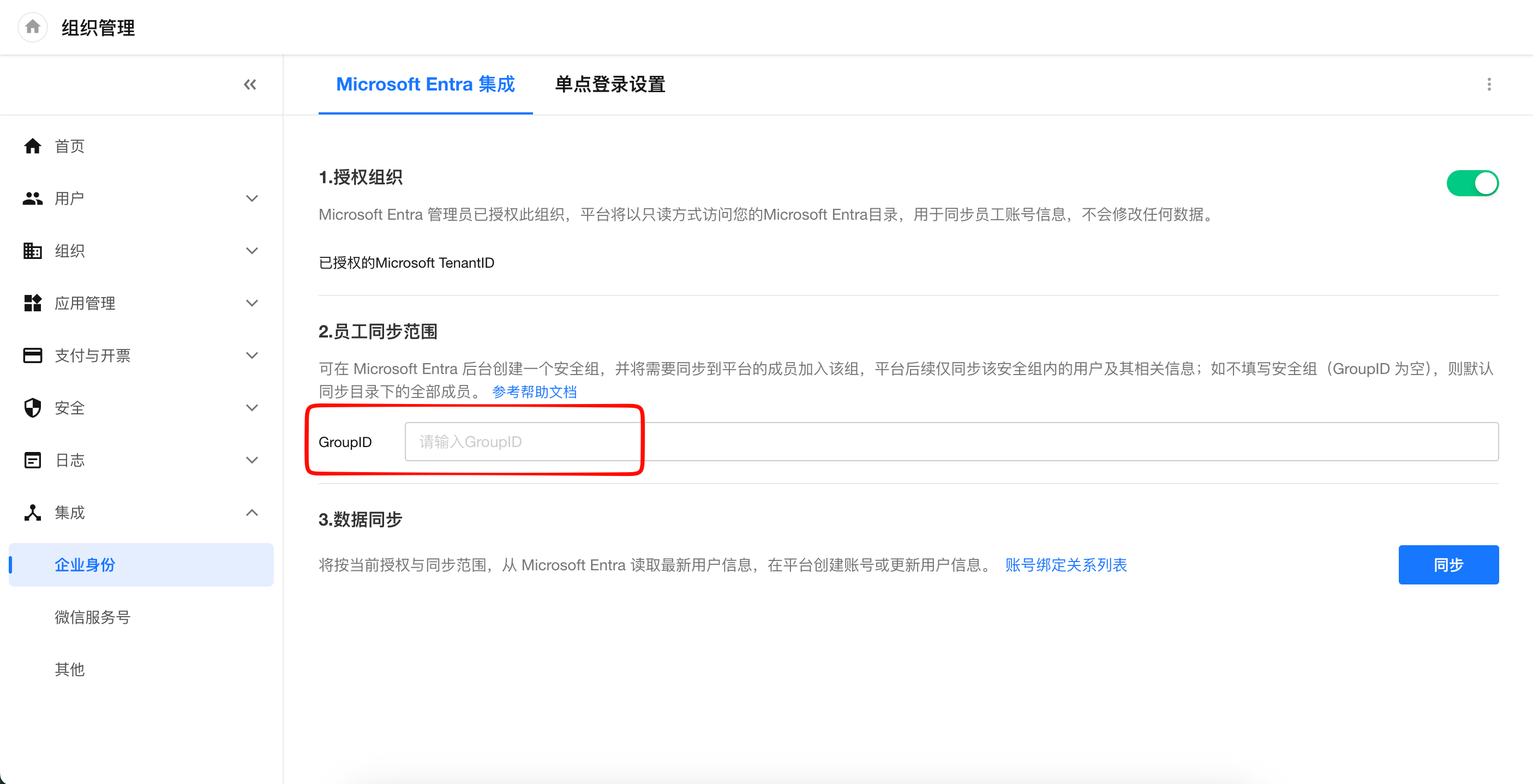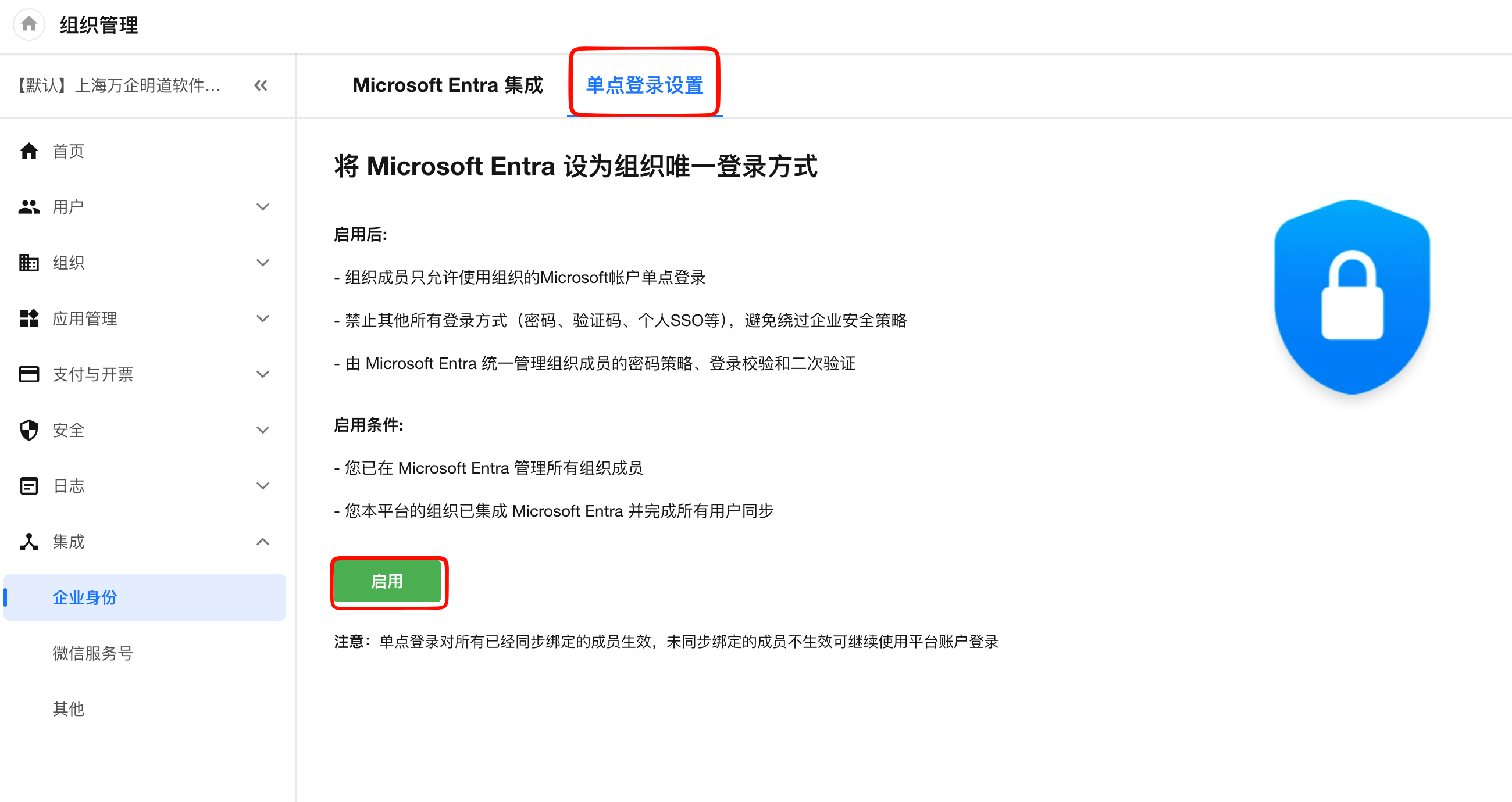 启用后:将禁用密码/验证码/其他 SSO 等登录方式,并由 Entra 统一管理组织的登录安全策略(如密码策略、登录校验、二次验证/MFA)。