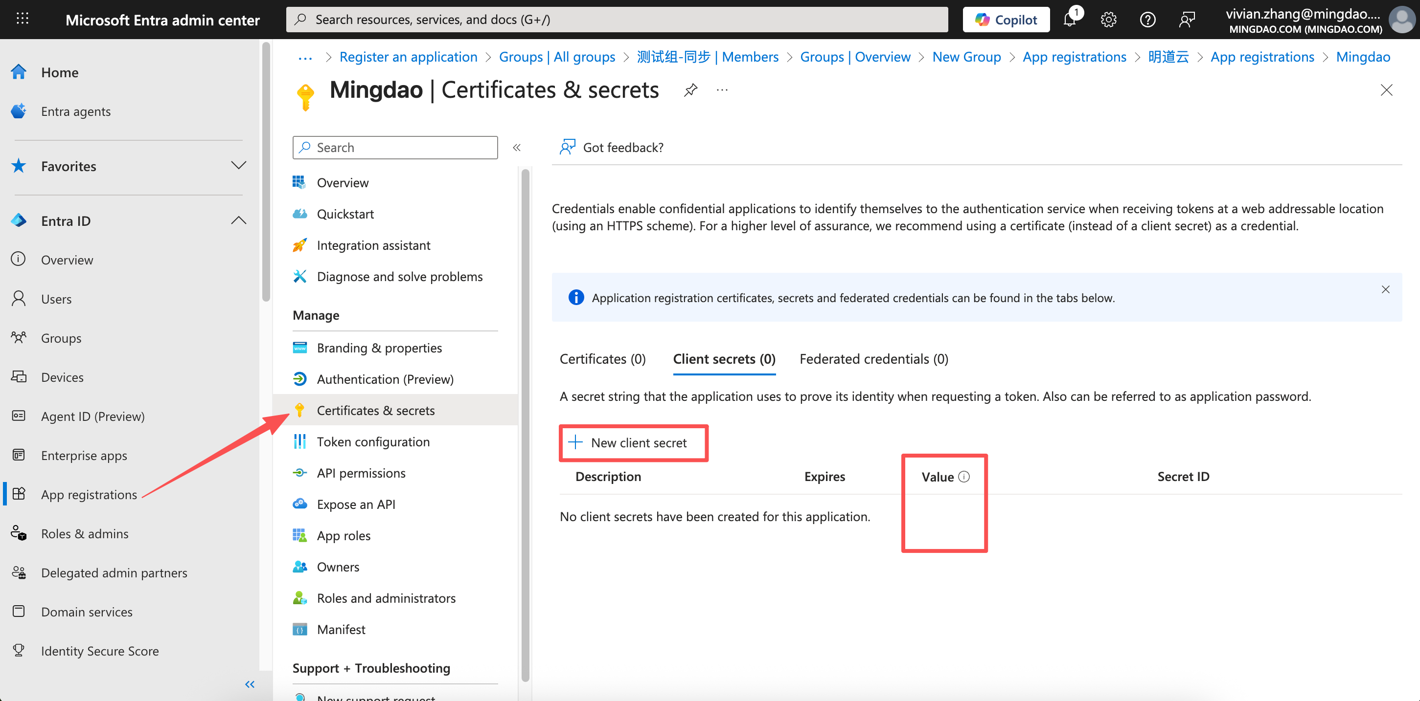 2)为Entra 应用创建应用密钥(Sercet),并将此密钥复制到平台管理后台中的 Entra配置服务中