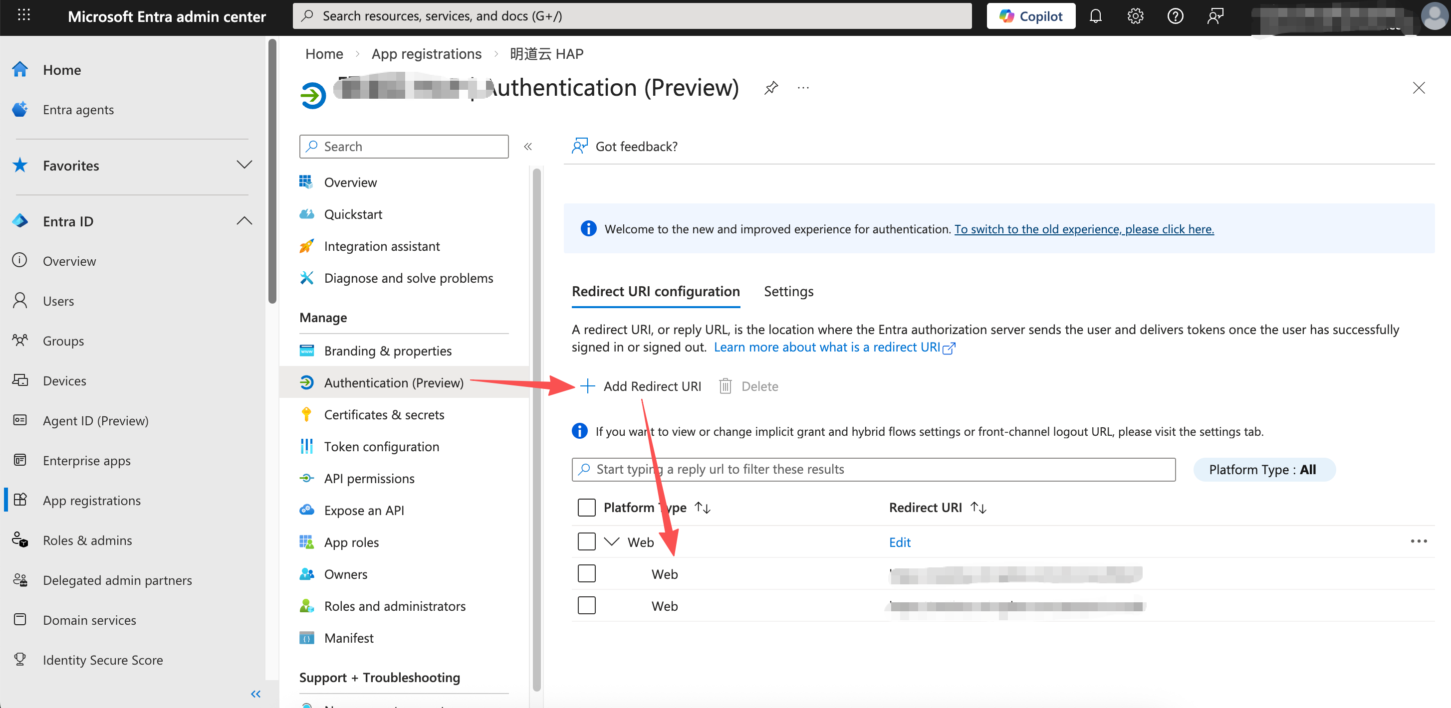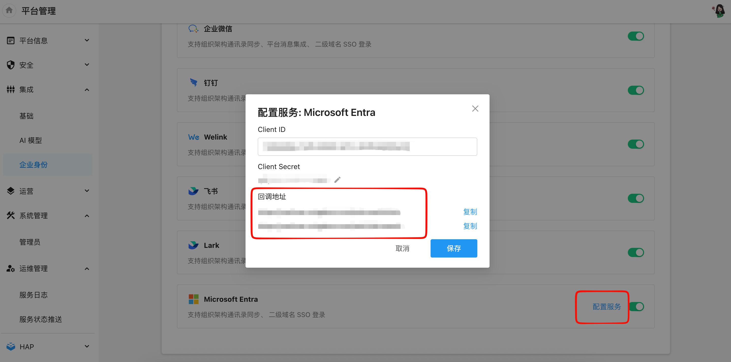 将平台管理后台生成的两个回调 URL 填入到 Entra 。