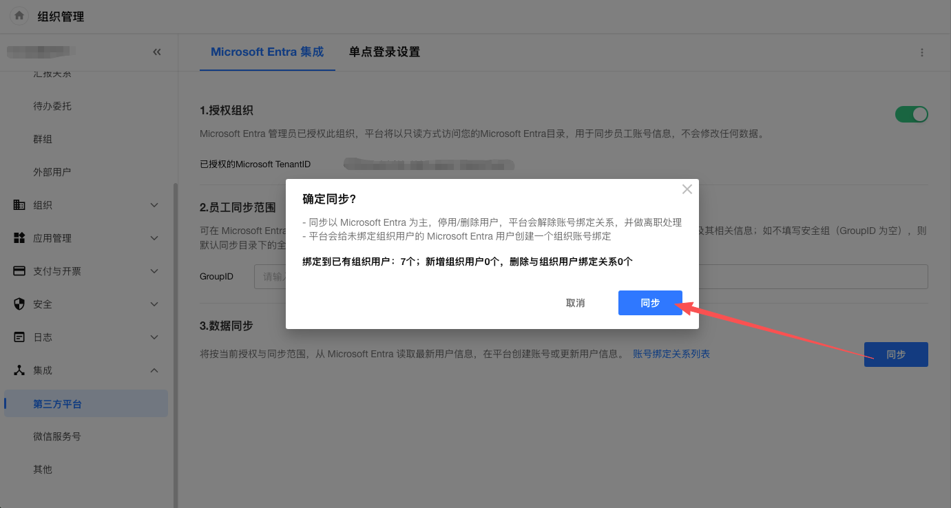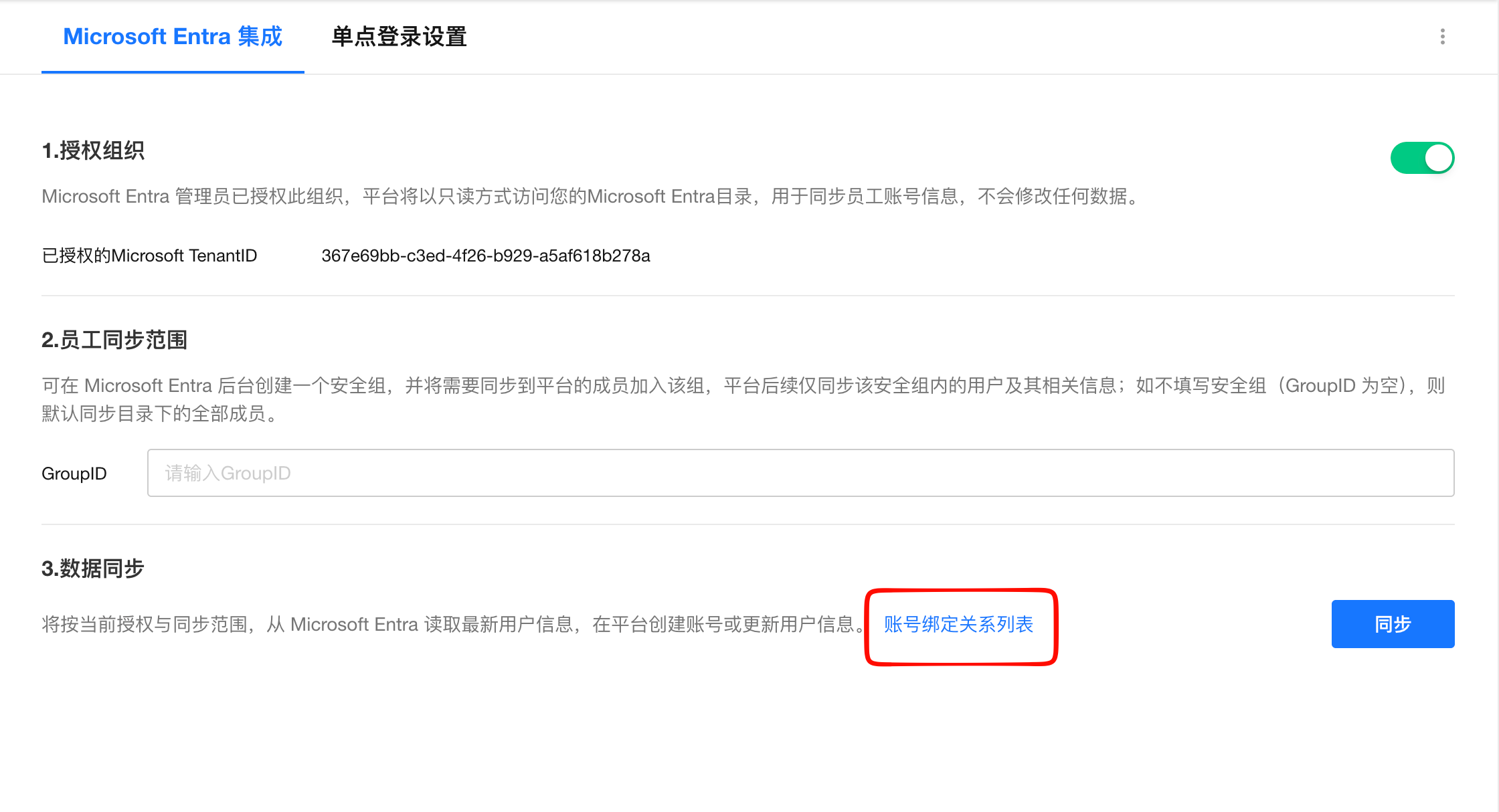 管理员在组织管理后台>集成>第三方平台>数据同步中,可以查看和管理现有的账号绑定关系。