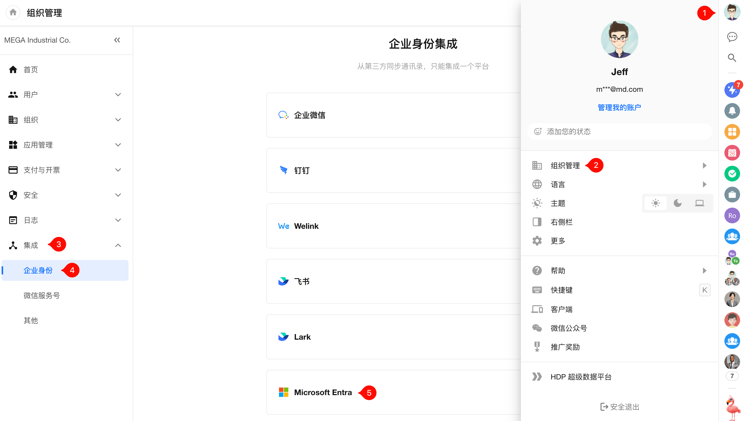 - 在HAP中,超级管理员点击【个人头像】 > 【组织管理】 > 【集成】 >【企业身份】,选择 “Microsoft Entra”。