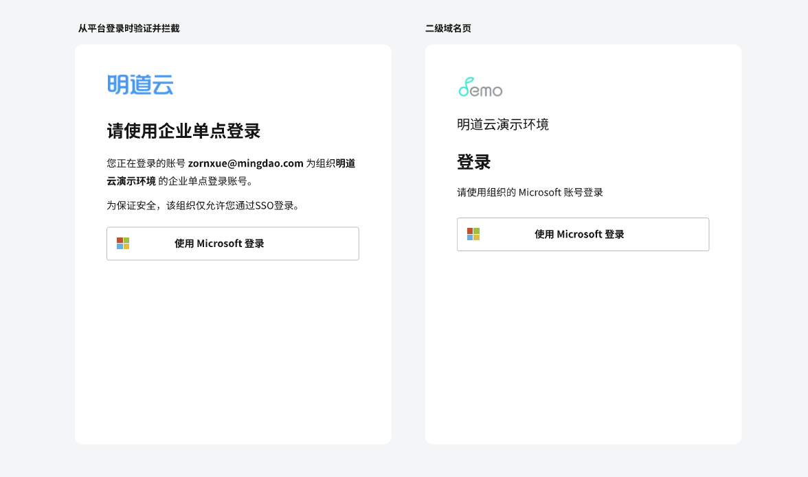 启用后,组织的登录页面将仅显示Microsoft Entra的登录入口,若用户在平台其他登录页使用其他方式登录时,将会被拦截。