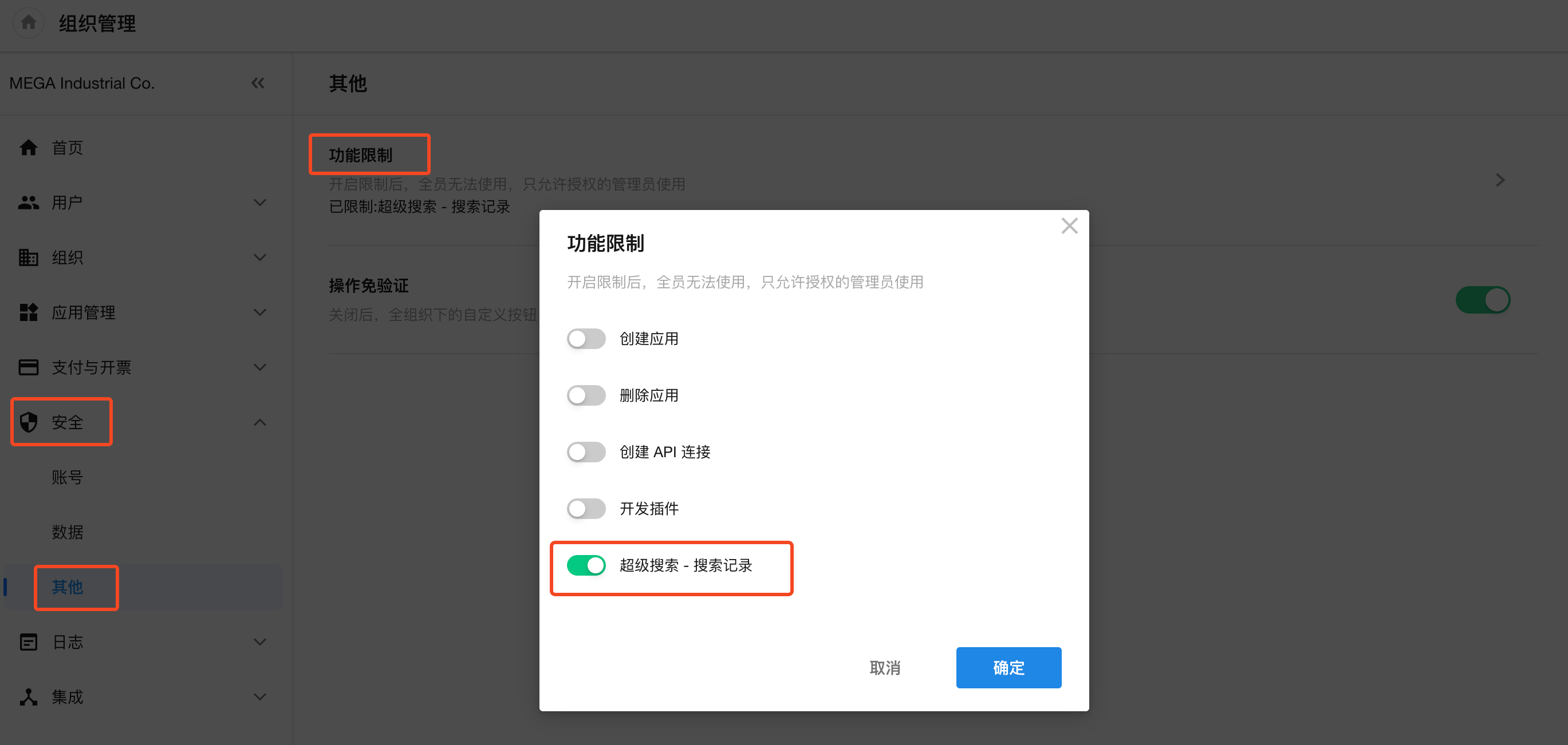 关闭或开启路径:组织管理员依次进入“组织管理后台” - “安全” - “其他” - “功能限制”。 关闭或开启超级搜索的记录搜索功能。