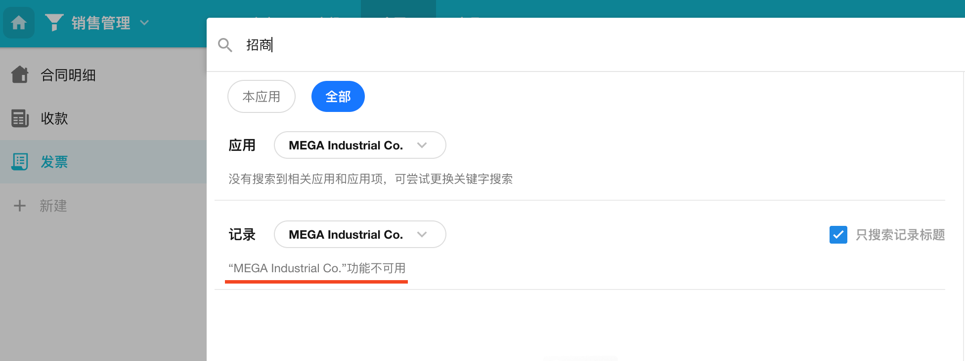 如果超级搜索结果中无法搜索记录,提示功能不可用,表示此组织下的超级搜索的记录搜索功能已经关闭。