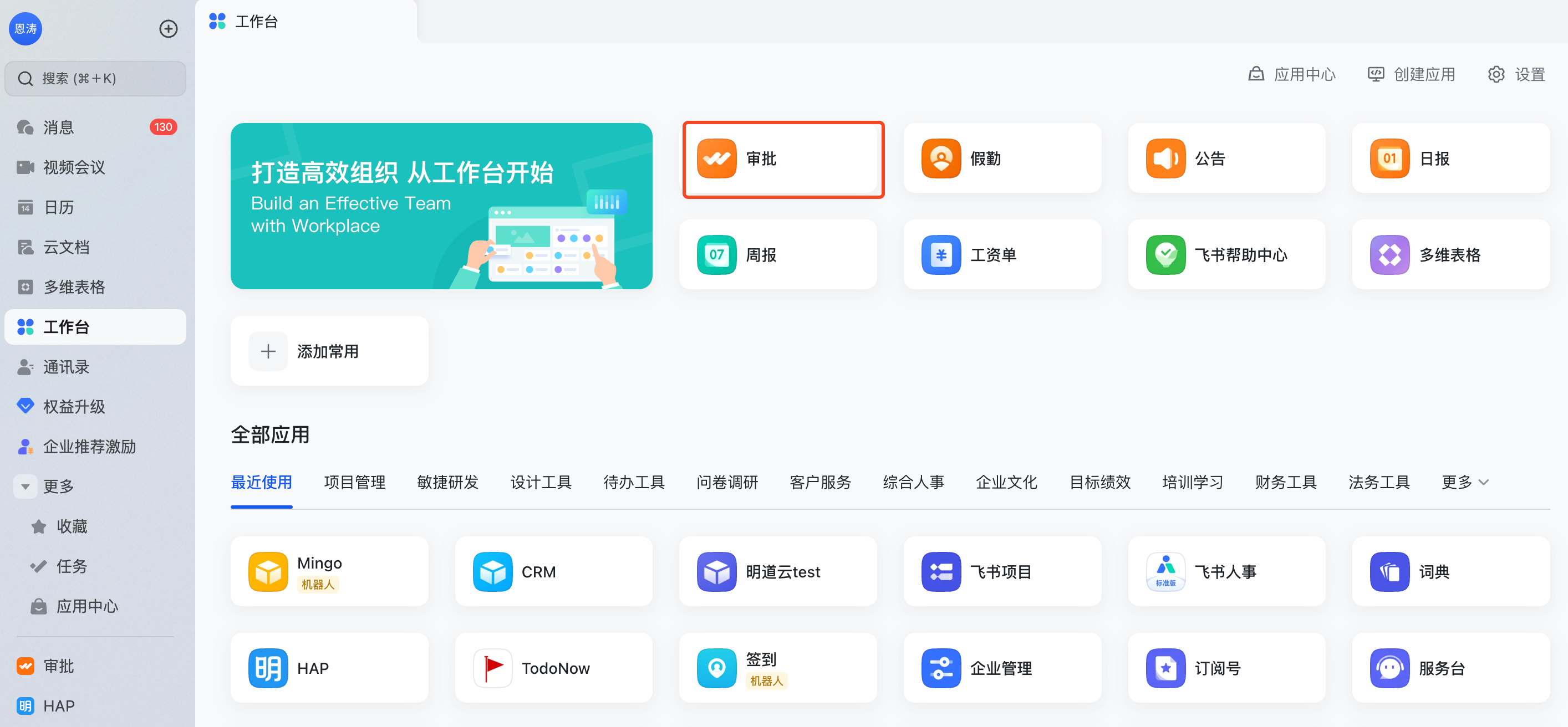 HAP平台集成后,可以将单个应用安装在飞书工作台,点击图标直接进入应用或指定工作表页面。