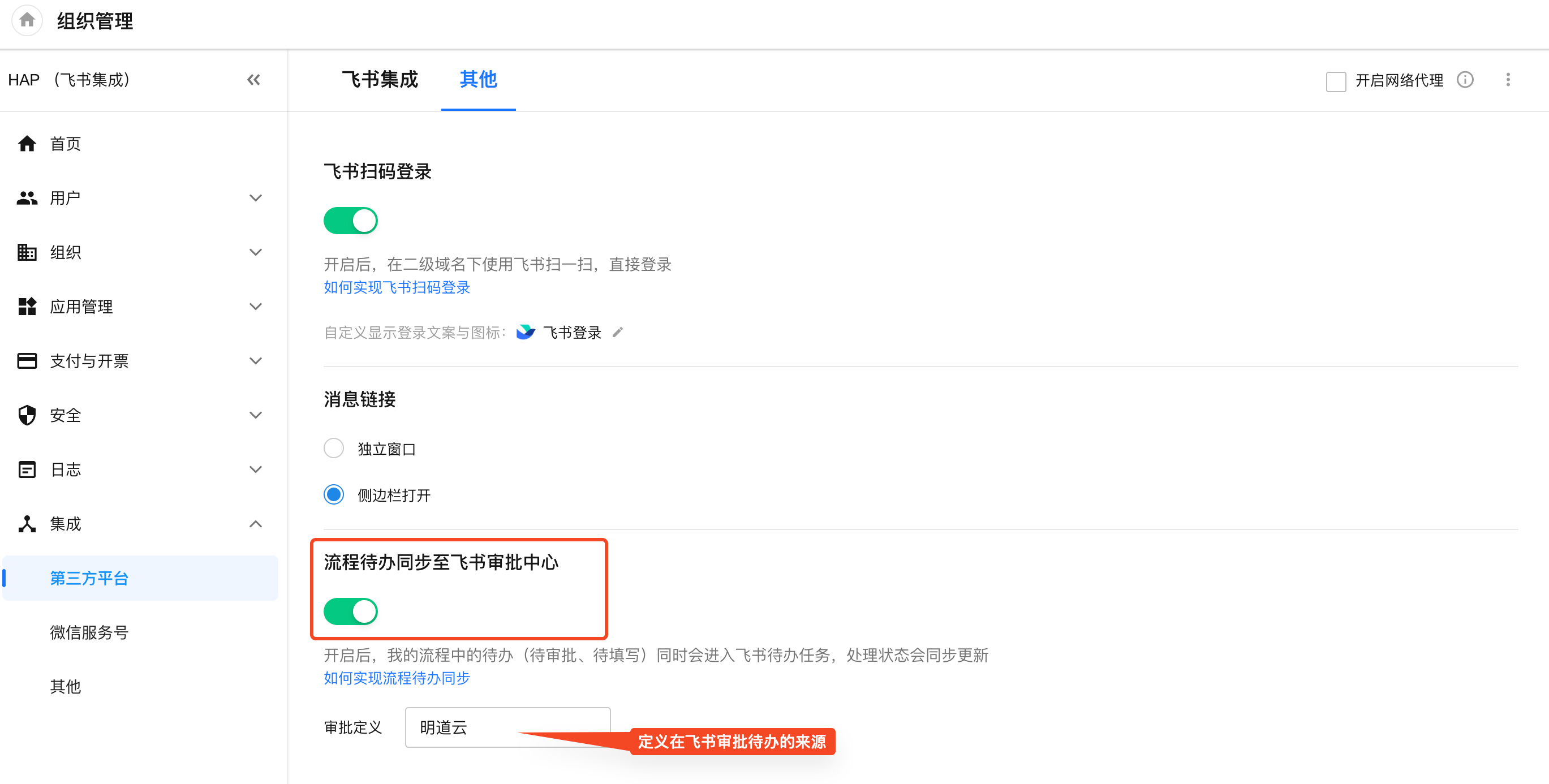 HAP可以在飞书中以自建应用的方式进行集成。集成后,支持直接将飞书侧的组织架构同步到HAP中,以及在飞书客户端直接打开HAP,另外也支持将应用与工作流消息推送到飞书。