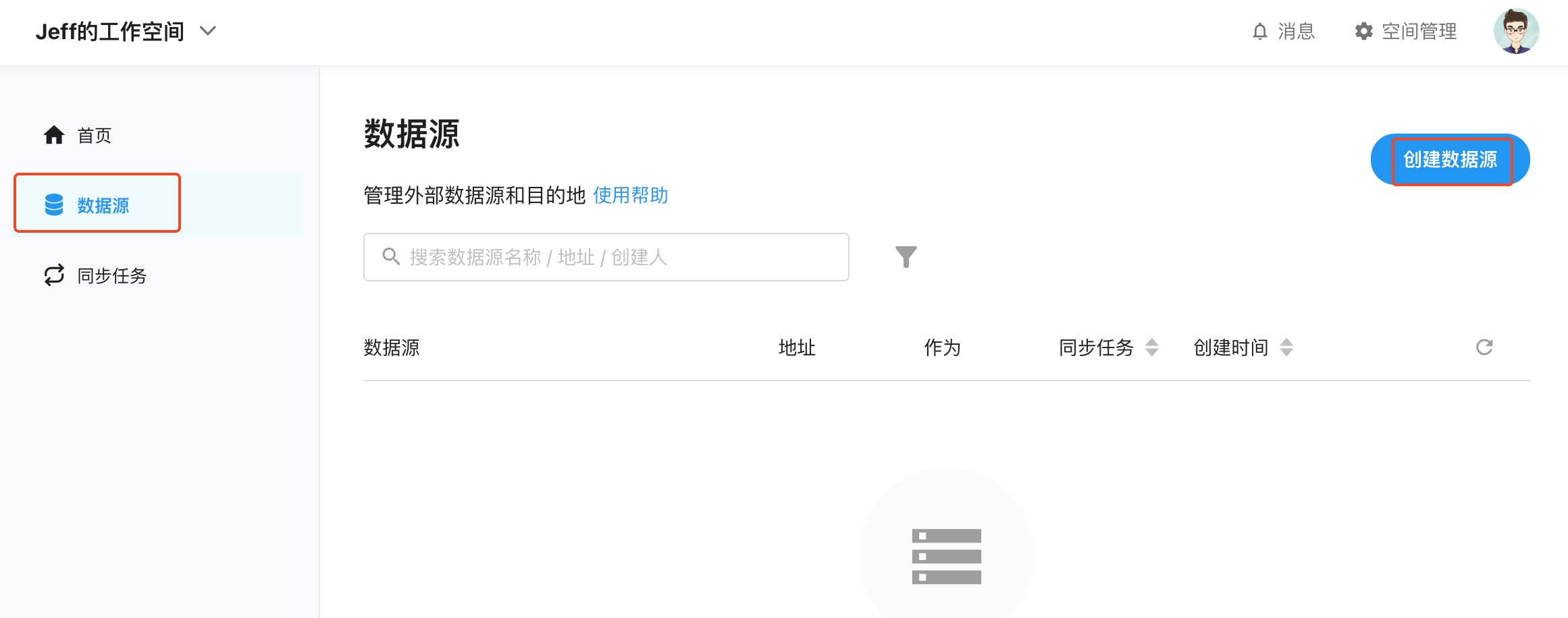 在工作空间左侧导航栏点击 “数据源” , 打开数据源管理页面。点击右上角「创建数据源」。
