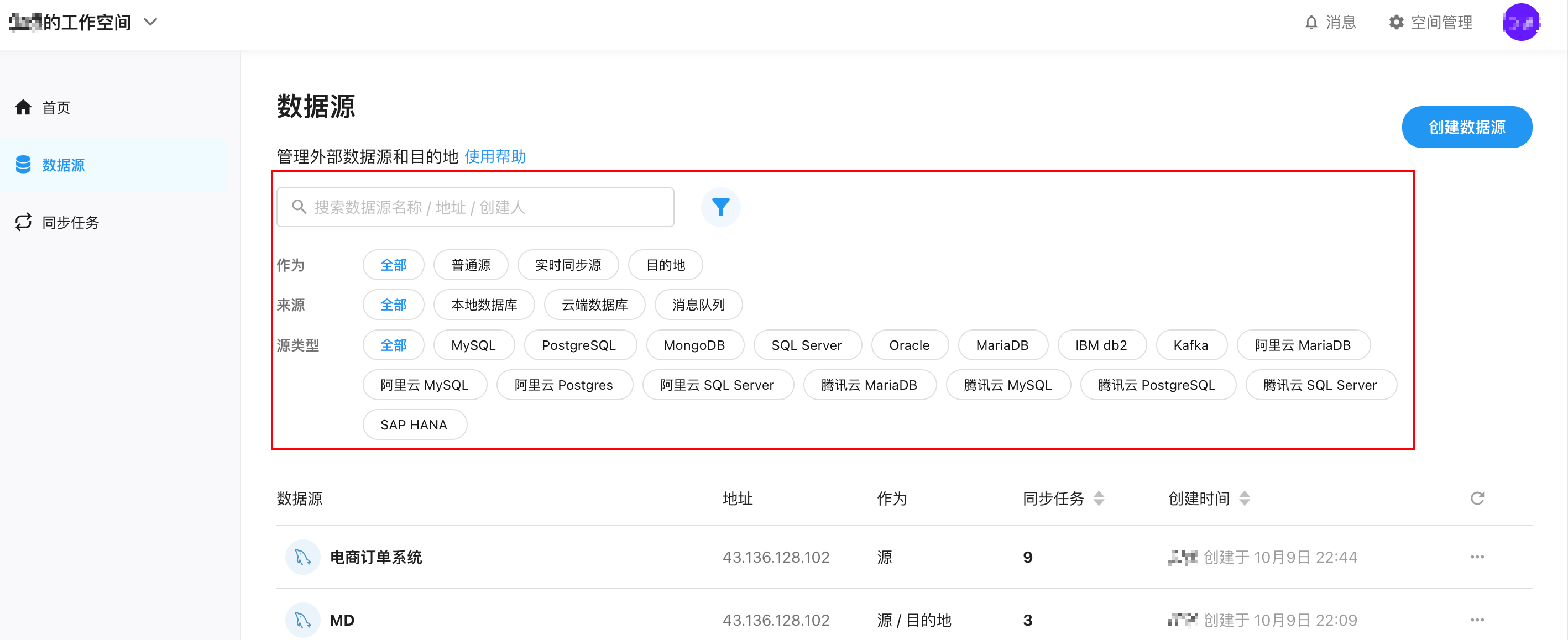 数据源模块用于管理平台连接的所有外部数据源,包括数据库、消息队列和目的地(写入端)。在创建同步任务之前,必须先在此处配置好数据源信息。
