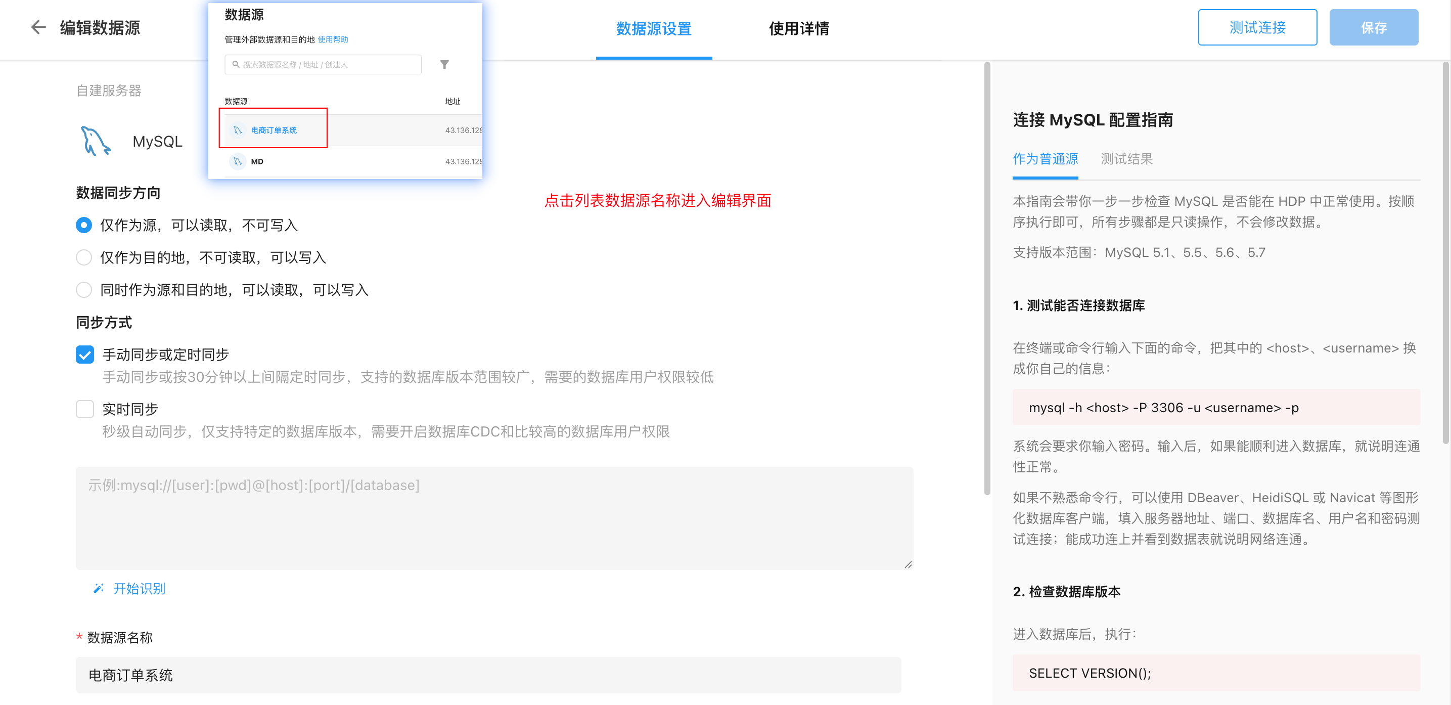 根据界面右侧指南一步一步检查数据源是否能在 HDP 中正常使用。按顺序执行即可,所有步骤都是只读操作,不会修改数据。