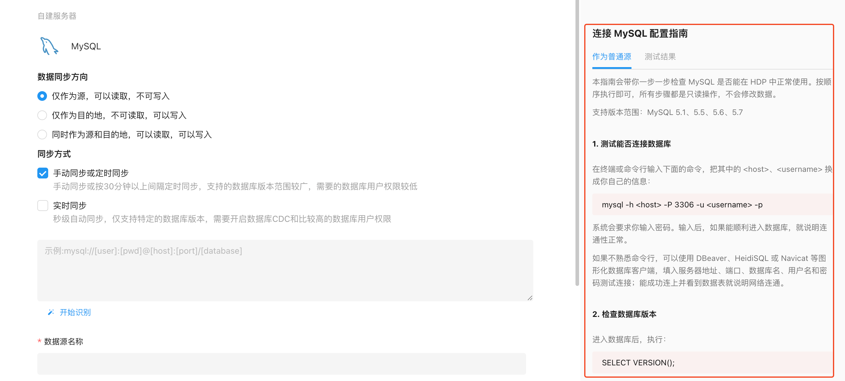 根据界面右侧指南一步一步检查数据源是否能在 HDP 中正常使用。按顺序执行即可,所有步骤都是只读操作,不会修改数据。